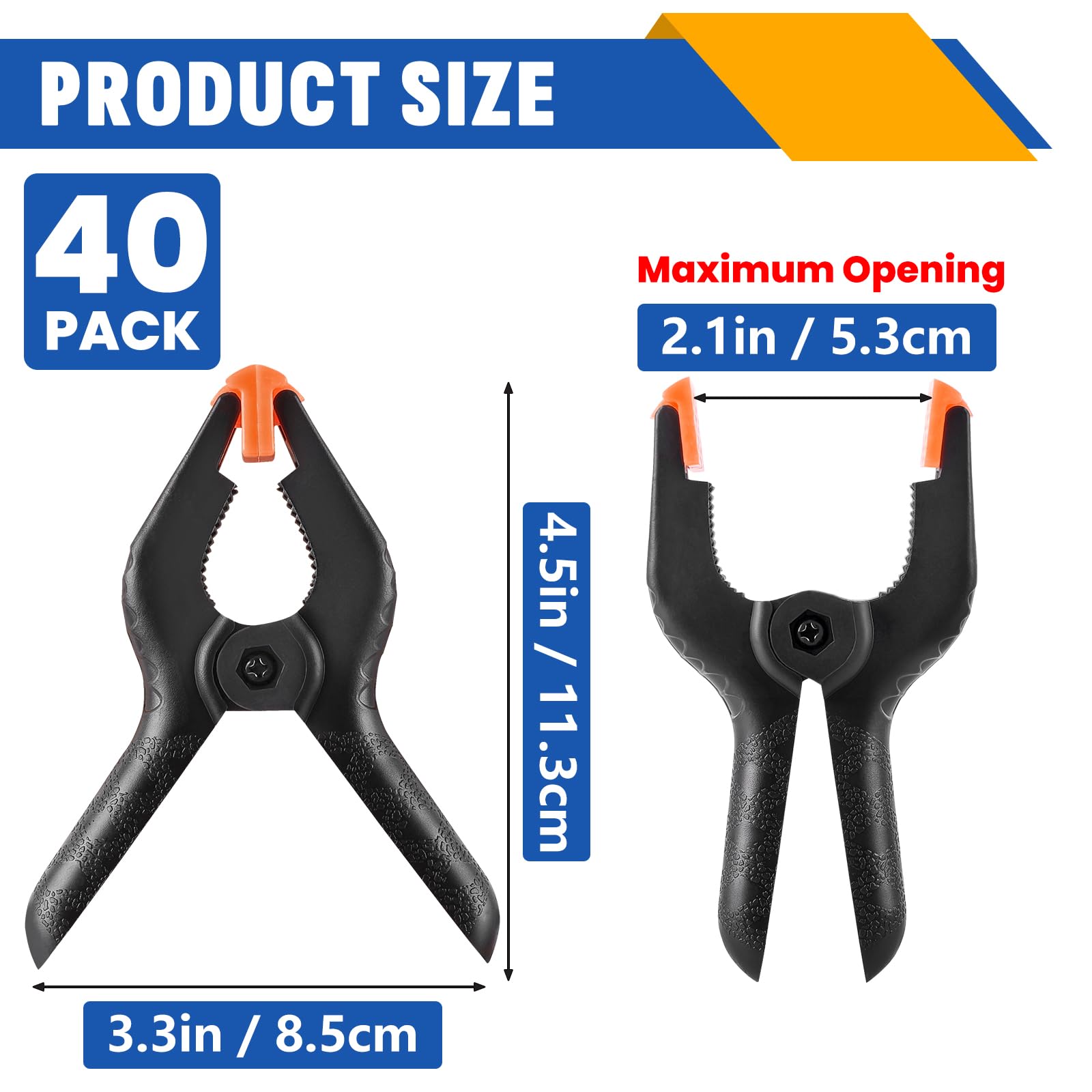【40 Pack Plastic Spring Clamps】Package includes 40 Pack 4.5 inch Plastic Spring Clamps, Each clamp is made of hard nylon to make them more sturdy and durable