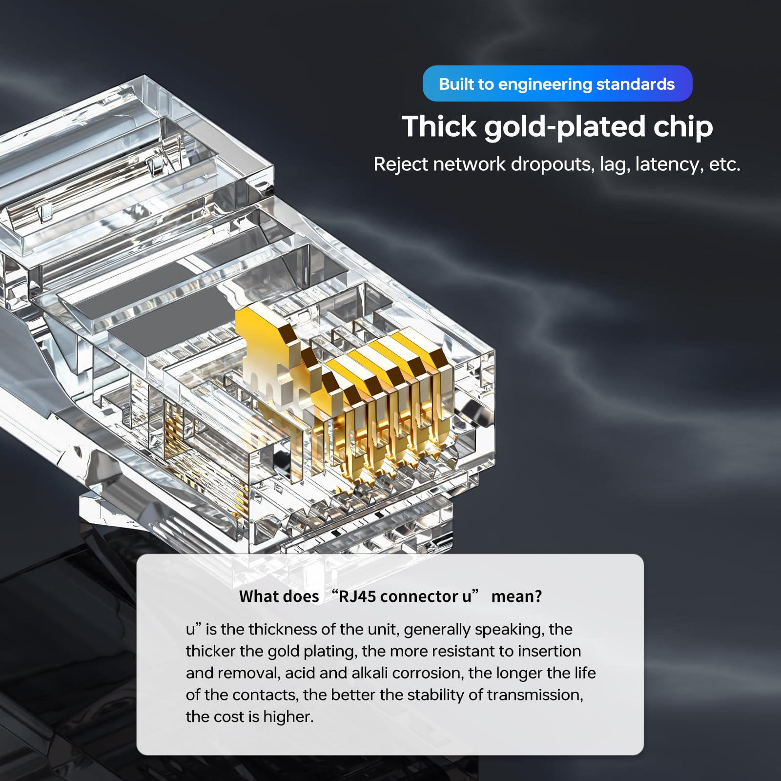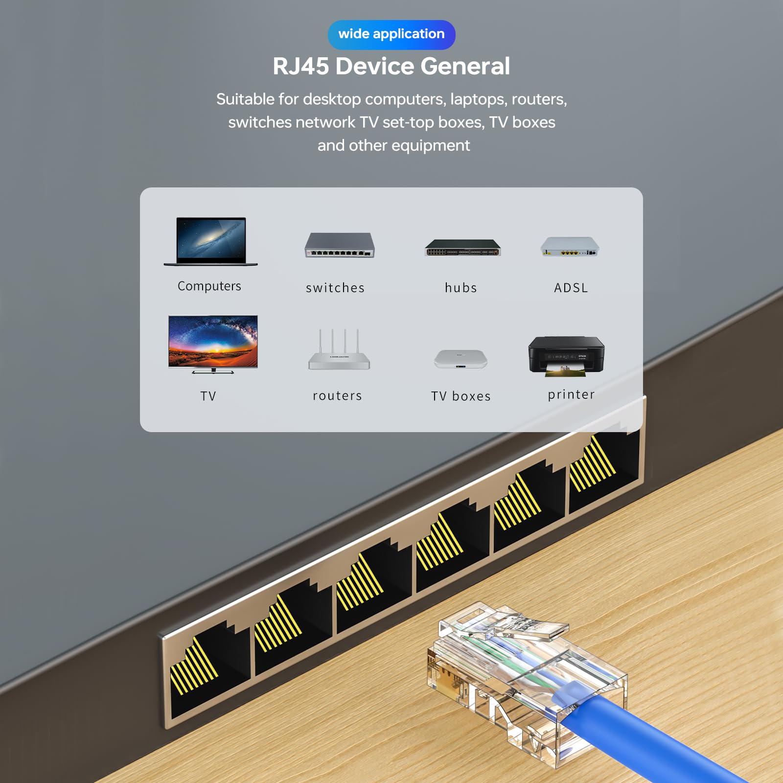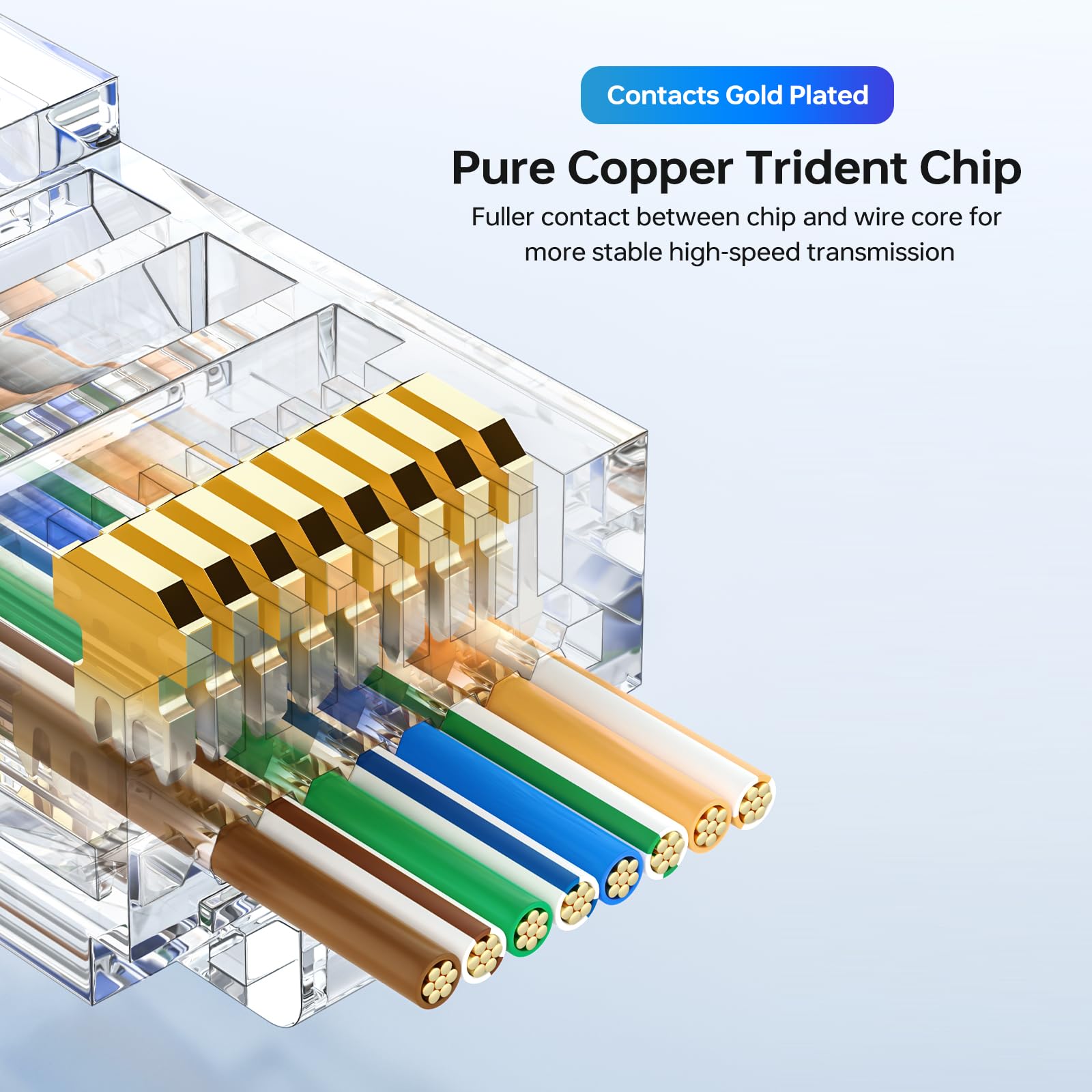 [ Stable Connection ] Three-layer metal, 24K gold-plated contacts for faster and more stable transmission, nickel-plated bottom copper for more durability, trident chip design for large-area contact with network cable, cat5e stable transmission rate at 100Mbps