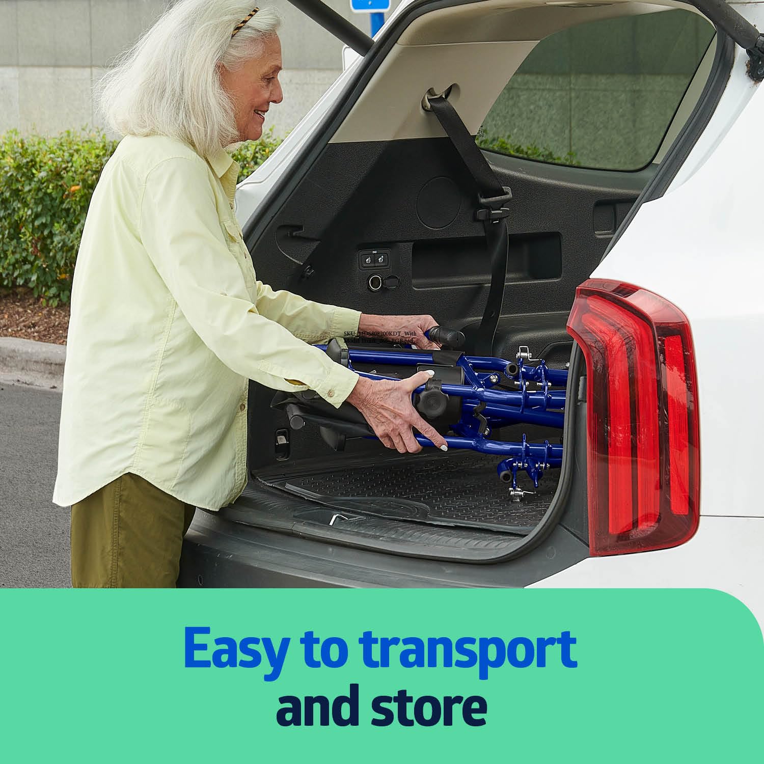 FOLDS EASILY FOR TRANSPORT: Compact design folds easily with swing-away footrest that lock in place for convenient storage and transport in car trunk; no assembly required with easy-clean nylon fabric