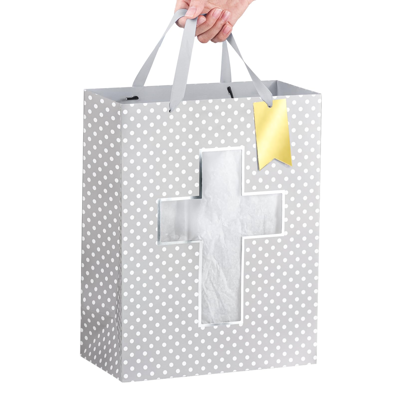 FEATURES: gift bag with the cross cut window, lettering on cute polka-dotted background, comes with nice ribbon handles and supportive reinforced bottom.