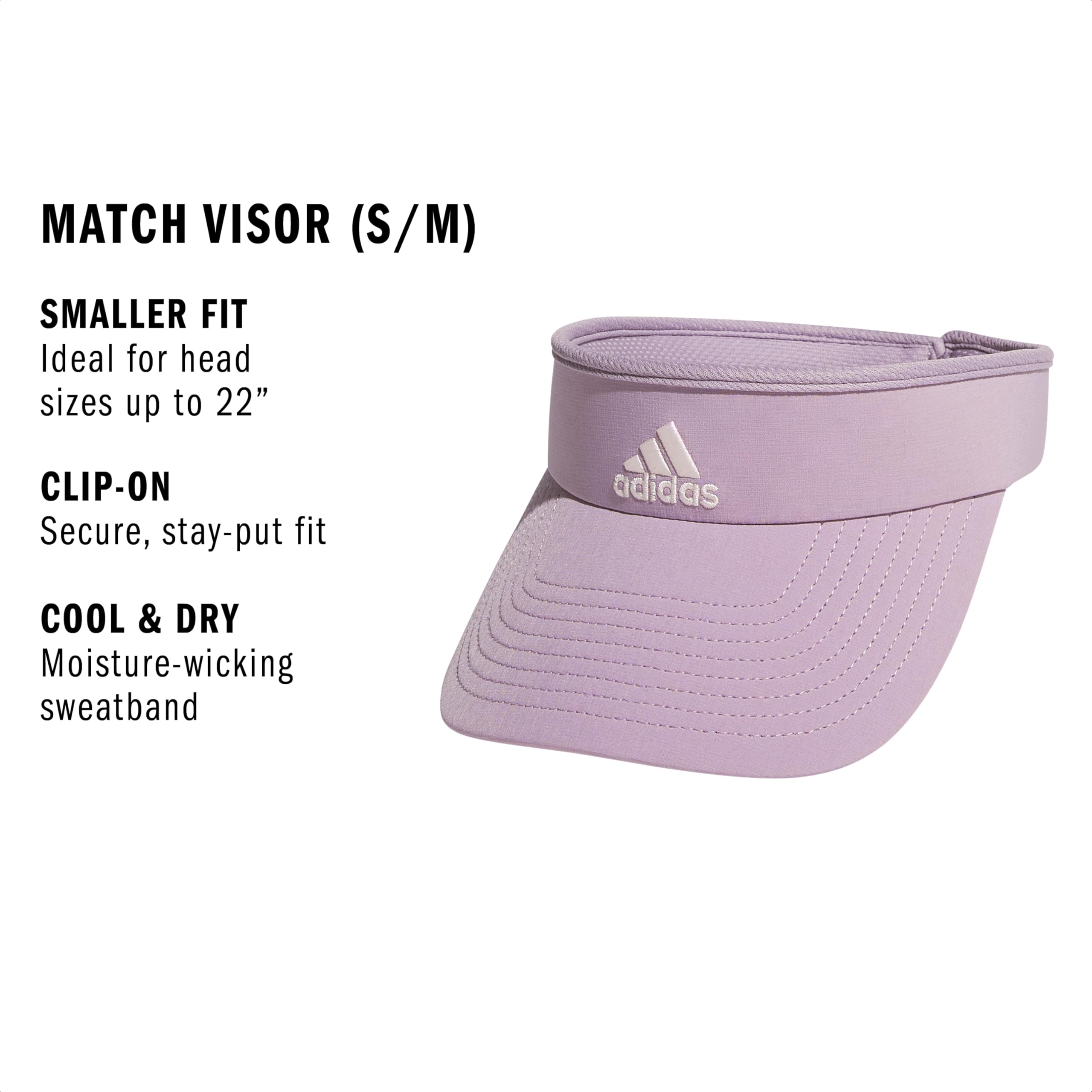 Description Keep glare and hair out of your eyes wearing this women's adidas Match 2 Visor. Its lightweight, one-size-fits-all design provides full brim coverage for the court, the beach or wherever. Sweat-wicking material keeps you dry through game, set and match.