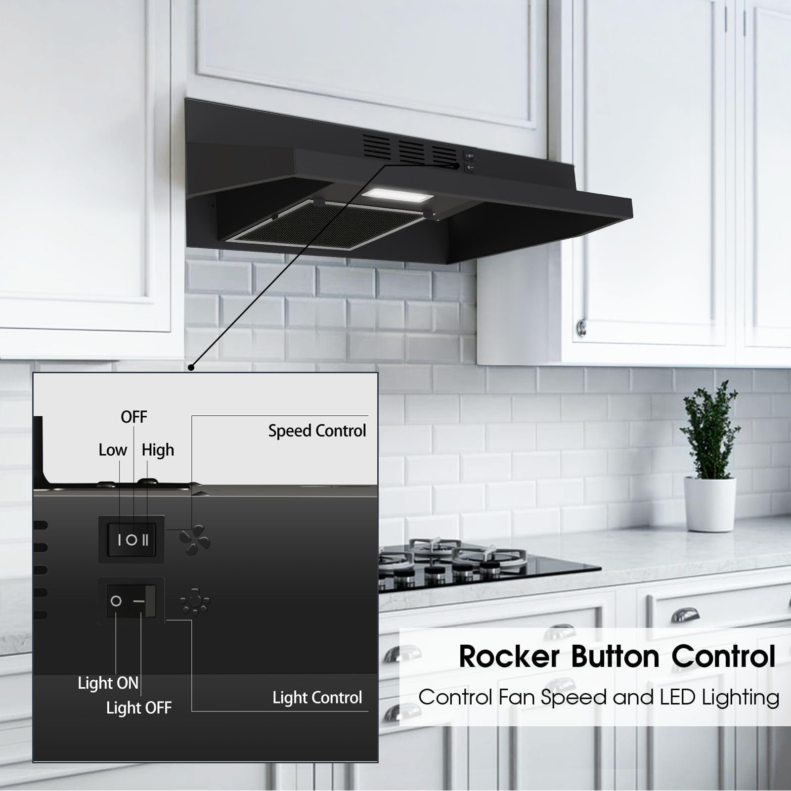 【280 CFM Efficient Suction】Features with 2 different speed fans, you can operate with the rocker button. The maximum 280 CFM 30 inch under cabinet range hood is suitable for all kinds of cooking style efficiently removing large amounts of smoke and cooking odors in the kitchen.