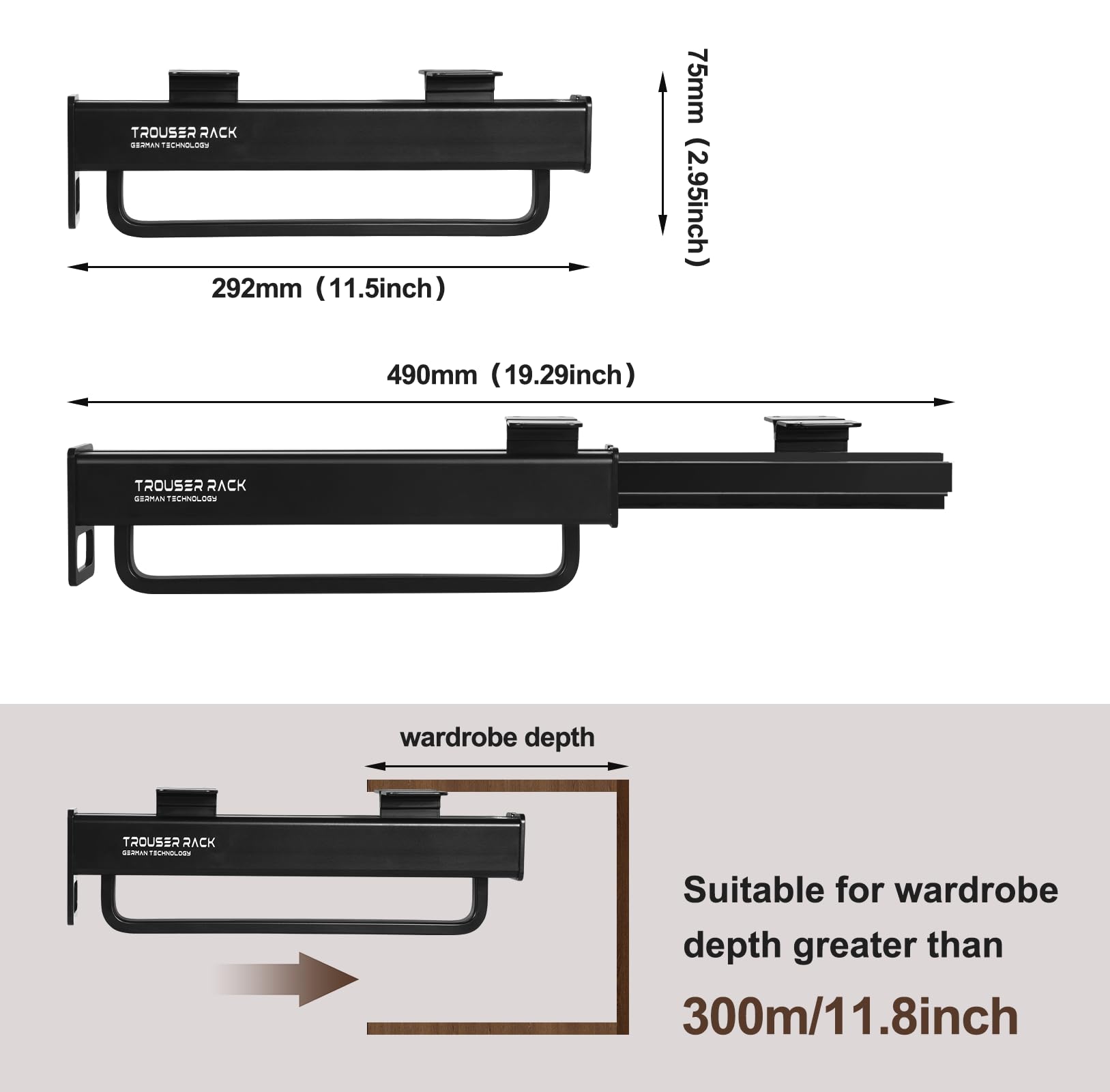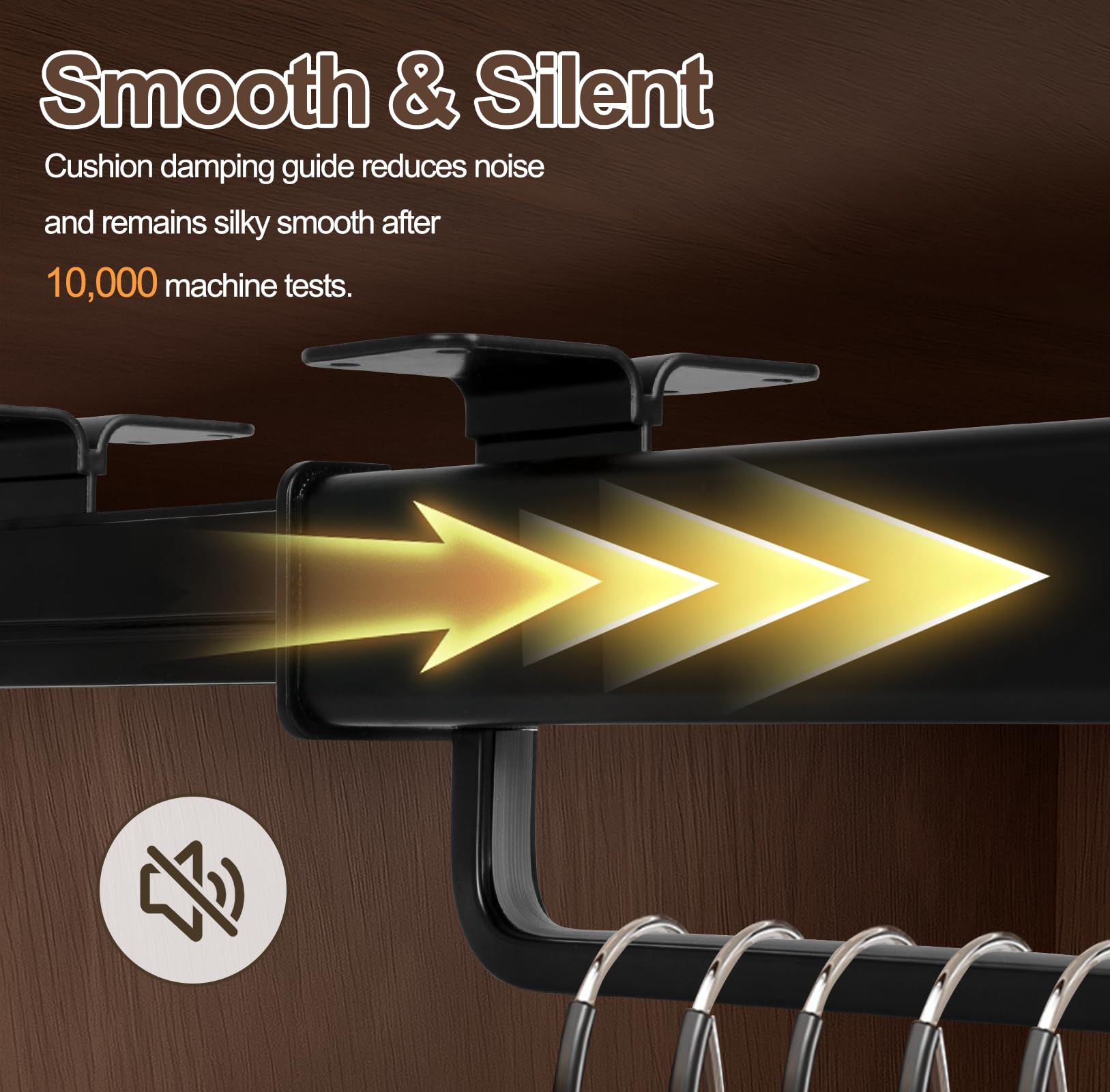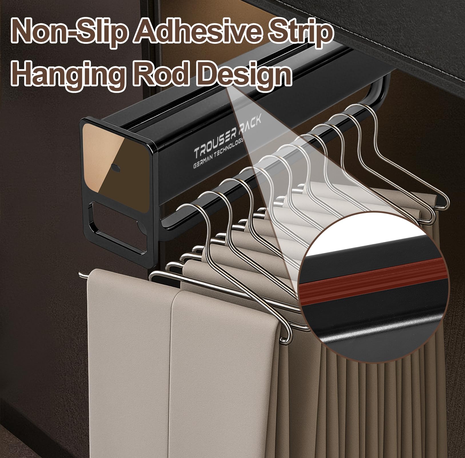 PUSH AND PULL MUTE AND SMOOTH: The trousers rack bar adopted cushion damping mute rail technology, the operation of pulling and pulling is light and energy-saving, extremely smooth, and the whole process is nearly noiseless, which makes it more convenient for you to pick up your daily clothes. After 10,000 times of high-intensity machine push and pull test, it still remains smooth and durable.
