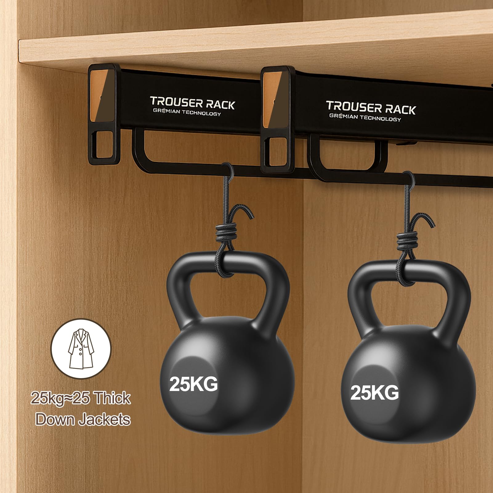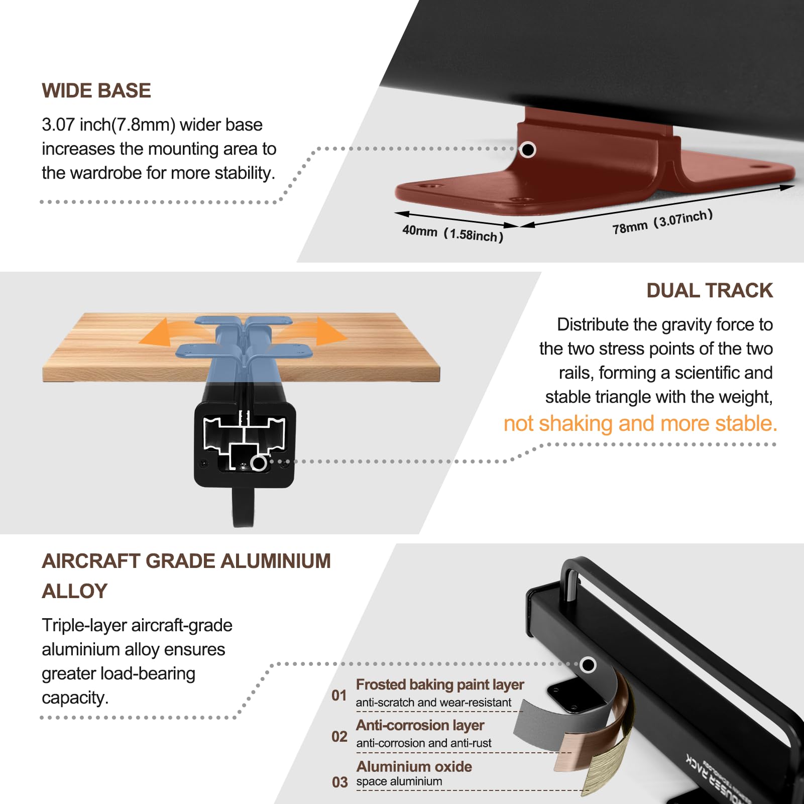 25KG STRONG WEIGHT CAPACITY : Aviation-grade aluminium alloy with innovative dual-rail design, giving the slide rail super load-bearing capacity. The double track scientifically disperses the load, forming a solid triangular force structure; at the same time, the wider contact surface between the adjustable sliding closet rail and the wardrobe greatly improves the hanging stability. After rigorous extreme testing, the load-bearing capacity of up to 25kg (equivalent to hanging 10 pieces of heavy down jackets at the same time).
