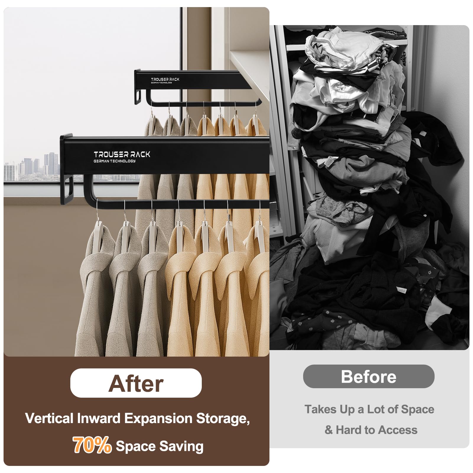 SAVE YOUR 70% SPACE : This pull-out valet rod can easily hold up to 30-40 thin pieces of clothing, easily storing more clothes, which can save up to 70% more space than regular hangers. It will keep your wardrobe neat and orderly, say goodbye to clutter and find your clothes and trousers from now on with less effort.