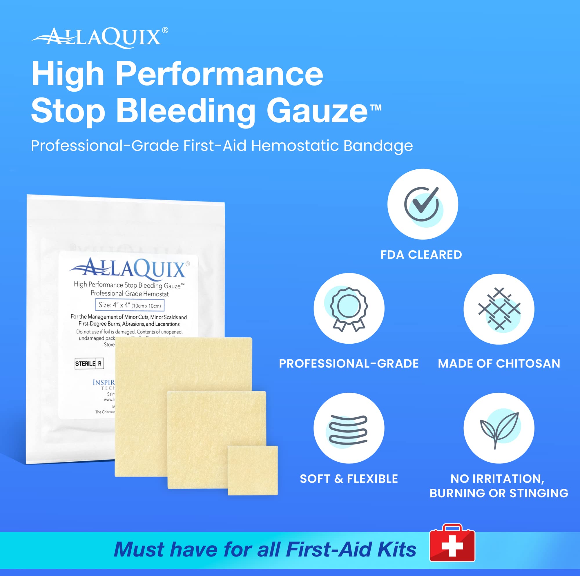 Stop Bleeding Fast Like The Pros: AllaQuix is a professional-grade hemostatic gauze pad designed to stop bleeding quickly from cuts, abrasions, and lacerations. Trusted by medical professionals and now available over-the-counter for first aid, emergency kits, and nosebleeds.