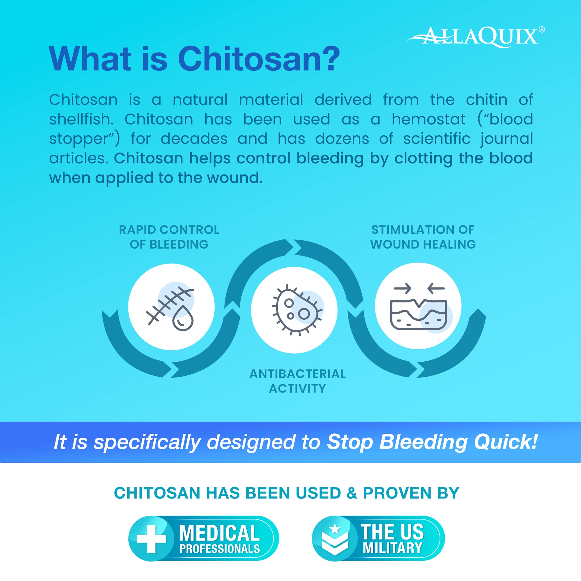 Hemostatic Gauze Made with Chitosan: AllaQuix uses medical-grade chitosan, the same material found in combat-proven military bandages. Chitosan forms a powerful barrier to stop blood flow—no chemicals or heat required.
