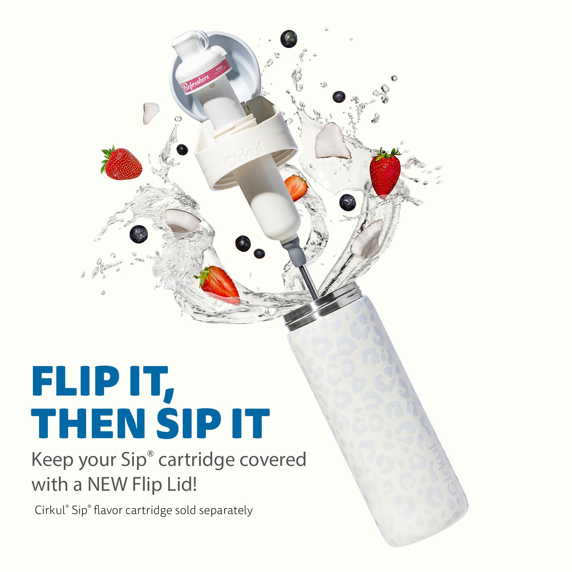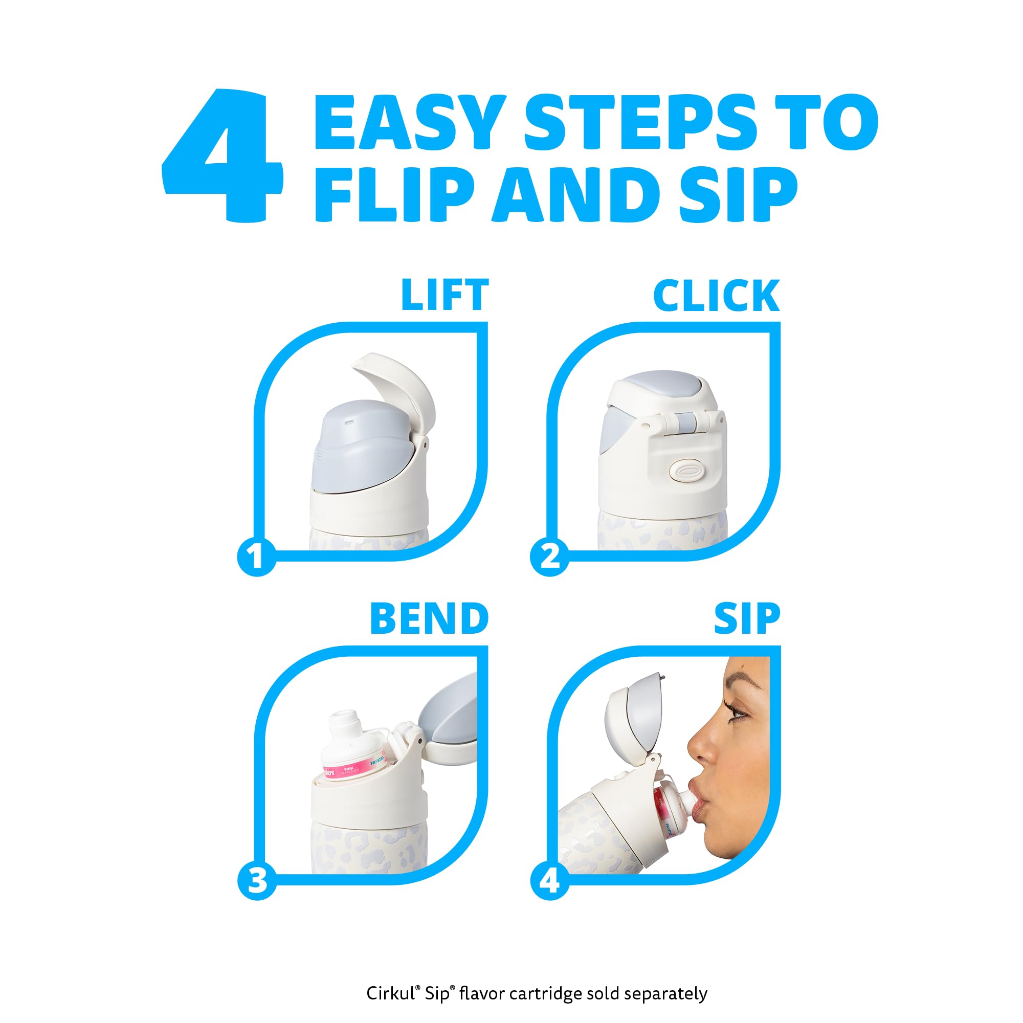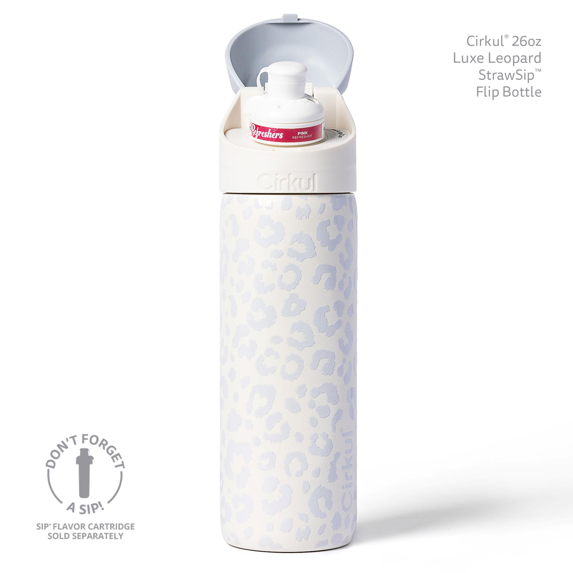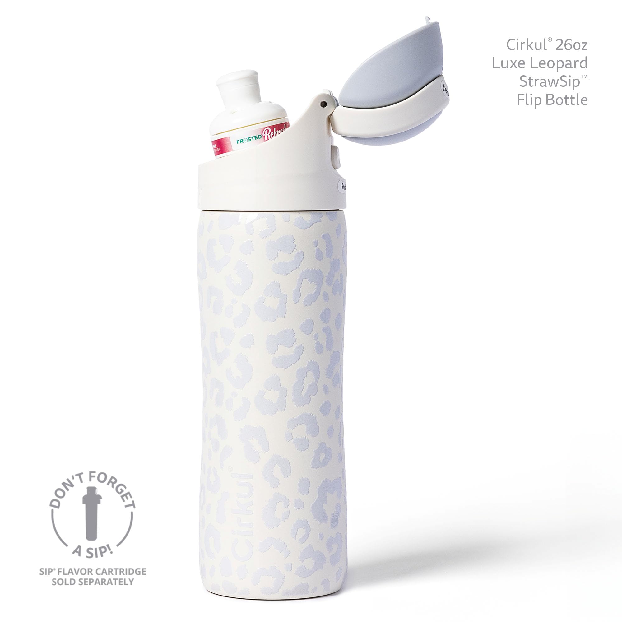 The StrawSip Flip Bottle is designed to flip the script on how you hydrate! This product includes one 26oz Luxe Leopard Stainless Steel Flip Bottle and a StrawSip Lid that supports a Cirkul Sip flavor cartridge to add refreshing flavors to your water (Sip not included). Simply click the back button to flip open the lid, then sip your favorite flavors! At Cirkul, our mission is to make drinking water delicious, convenient, and fun.