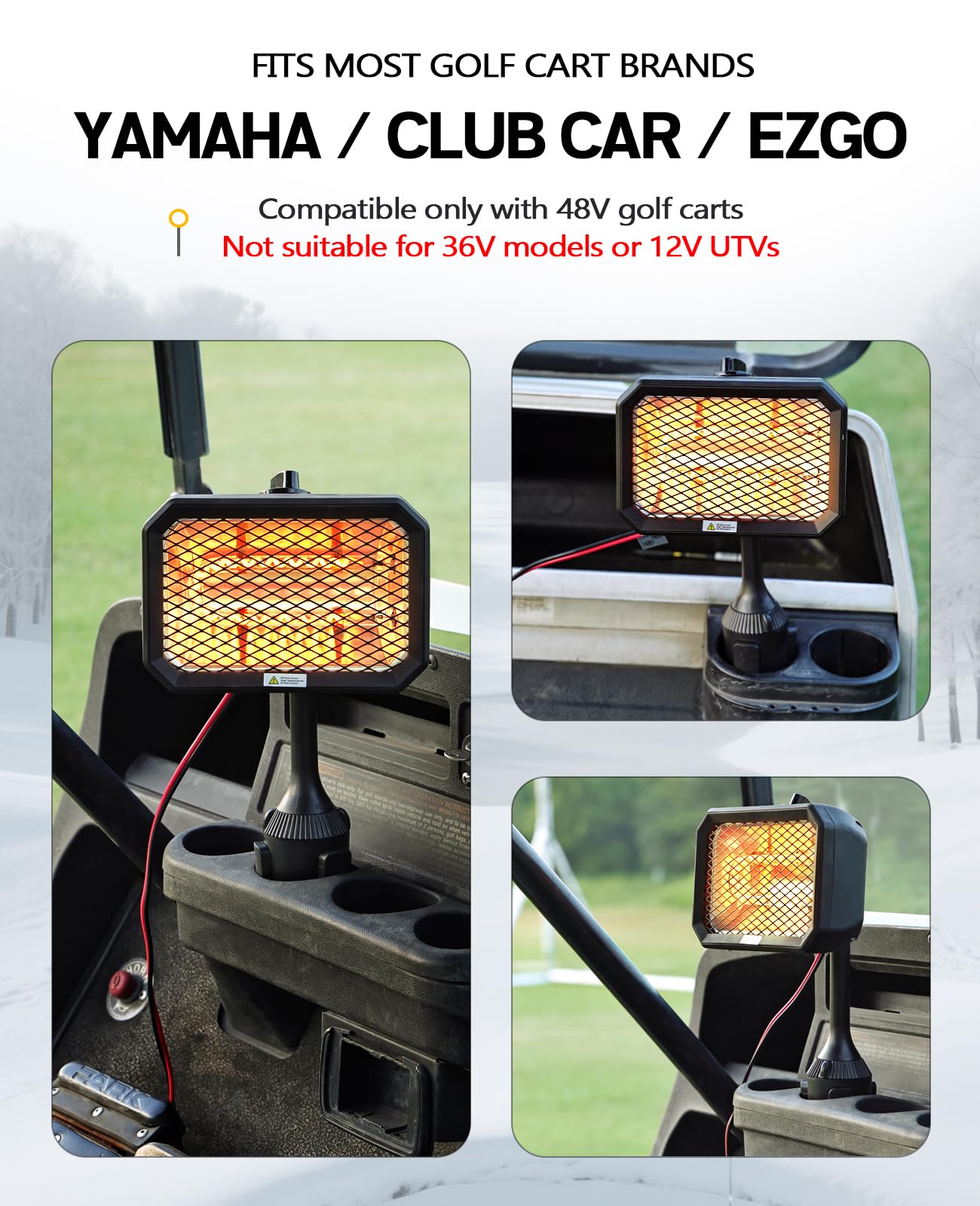 Energy-Efficient & Durable – Carbon fiber heating tech of the golf cart heaters ensures 98% efficiency, rapid warmth, and long-lasting performance without oxidation. No need to refuel—just connect to your 48V golf cart. (The unit is hardwired directly to the battery, NOT a plug-in device, NOT for 12V/36V UTVs).