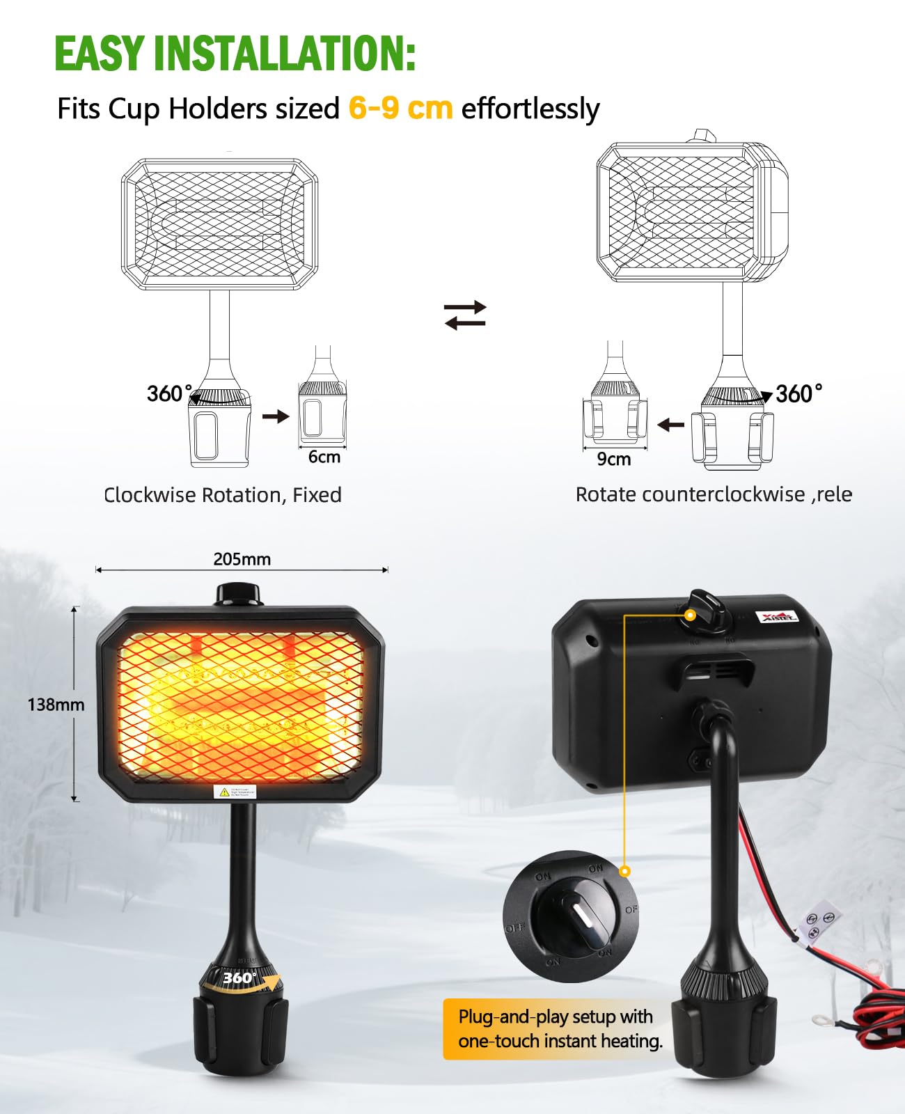 Universal Fit & Easy Use – Our heaters for golf carts securely fit most golf carts (Yamaha, Club Car, EZGO) in 6-9cm cup holders. No assembly or fuel tanks required—enjoy instant heat with a simple switch.