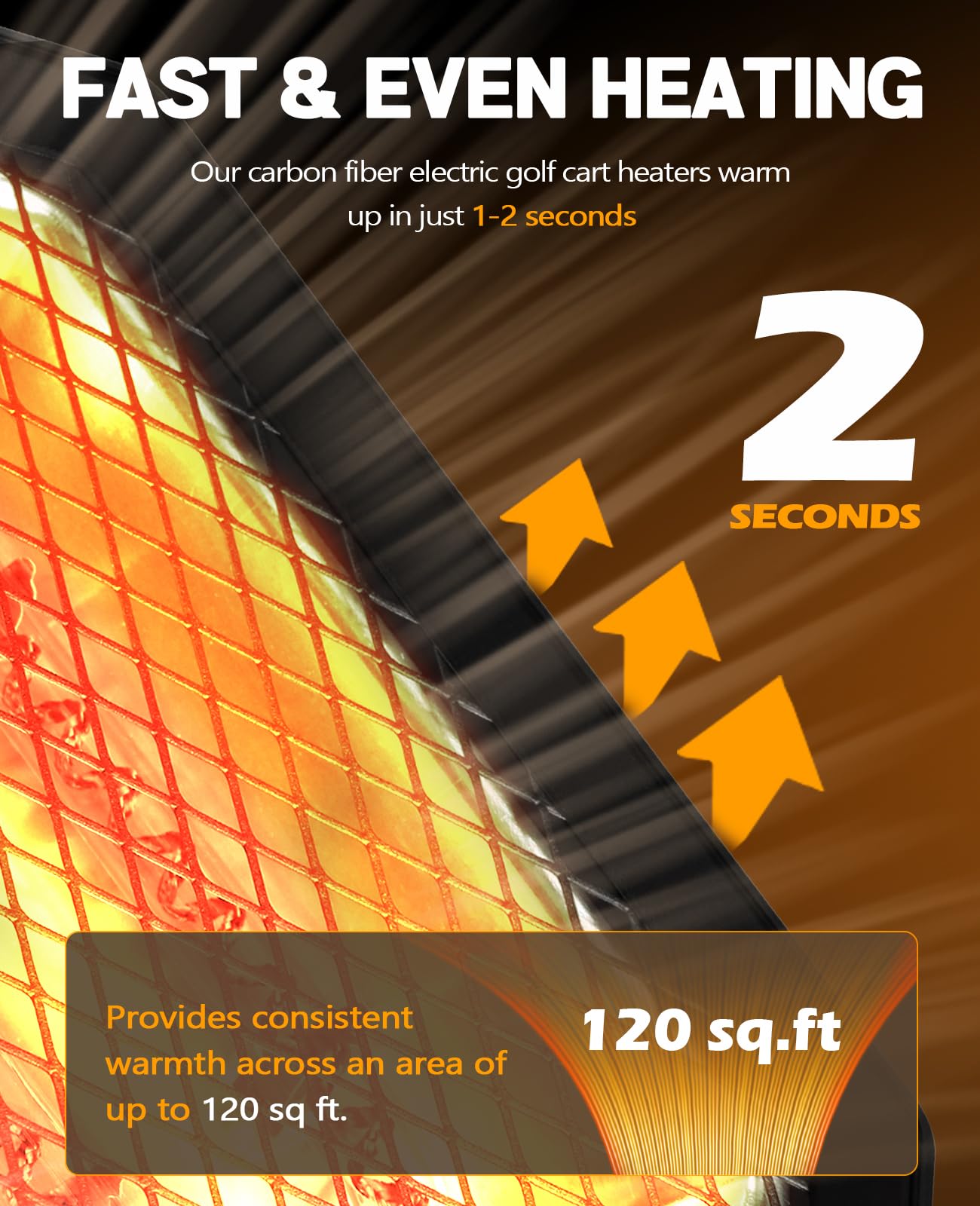 Fast & Even Heating – Our carbon fiber electric heater for golf cart warms up in just 1-2 seconds, distributing heat evenly across your golf cart (up to 120 sq.ft). Unlike radiant heaters that only heat what’s directly in front, our electric golf heater for cart provides consistent warmth without cold spots.