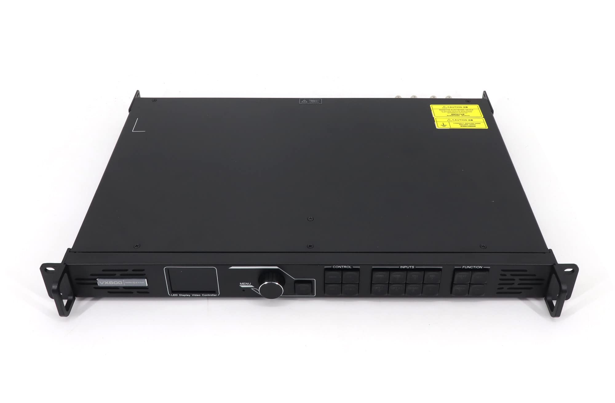 The VX600 is NovaStar’s new all-in-one controller that integrates video processing and video control into one box. It features 6 Ethernet ports and supports video controller, fiber converter and Bypass working modes. A VX600 unit can drive up to 3.9 million pixels, with the maximum output width and height up to 10,240 pixels and 8192 pixels respectively, which is ideal for ultra-wide and ultra-high LED screens. The VX600 is capable of receiving a variety of video signals and processing high-resolution images. In addition, the device features stepless output scaling, low latency, pixel-level brightness and chroma calibration and more, to present you with an excellent image display experience. Input connectors − 1x HDMI 1.3 (IN & LOOP) − 1x HDMI 1.3 − 1x DVI (IN & LOOP) − 1x 3G-SDI (IN & LOOP) − 1x 10G optical fiber port (OPT1) Output connectors − 6x Gigabit Ethernet ports Self-adaptive OPT 1 for either video input or sending card output Thanks to the self-adaptive design, OPT 1 can be used as either an input or output connector, depending on its connected device. Audio input and output − Audio input accompanied with HDMI input source − Audio output via a multifunction card − Output volume adjustment supported Low latency Reduce the delay from the input to receiving card to 20 lines when the low latency function and Bypass mode are both enabled. 3x layers − Adjustable layer size and position − Adjustable layer priority Output synchronization An internal input source or external Genlock can be used as the sync source to ensure the output images of all cascaded units in sync. Powerful video processing − Based on SuperView III image quality processing technologies to provide stepless output scaling − One-click full screen display − Free input cropping Easy preset saving and loading − Up to 10 user-defined presets supported − Load a preset by simply pressin