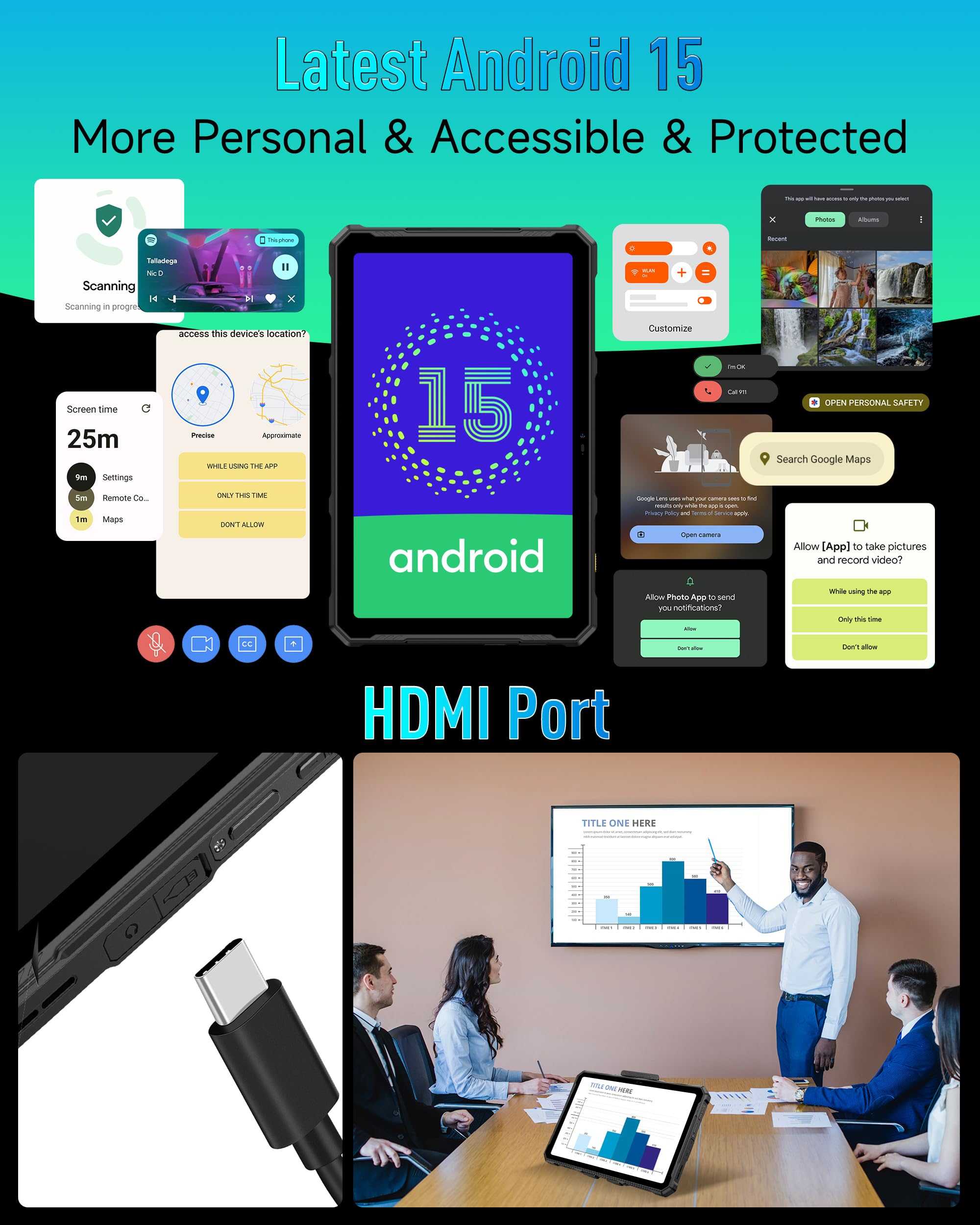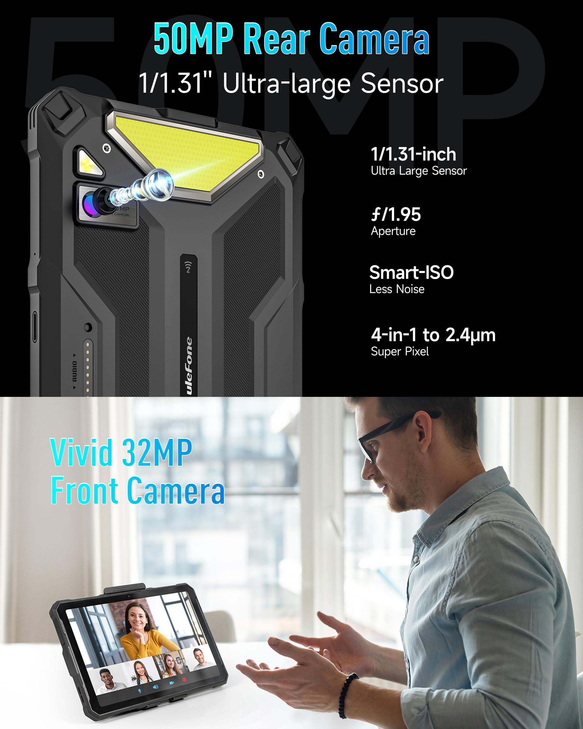 📷【50MP Rear + 32MP Frone Camera】Ulefone Armor Pad 4 Ultra rugged tablet features a 32MP front-facing camera and a 50MP camera on the rear side. It takes you an enhanced experience of online meeting, video calls,Record every wonderful moment of yours.