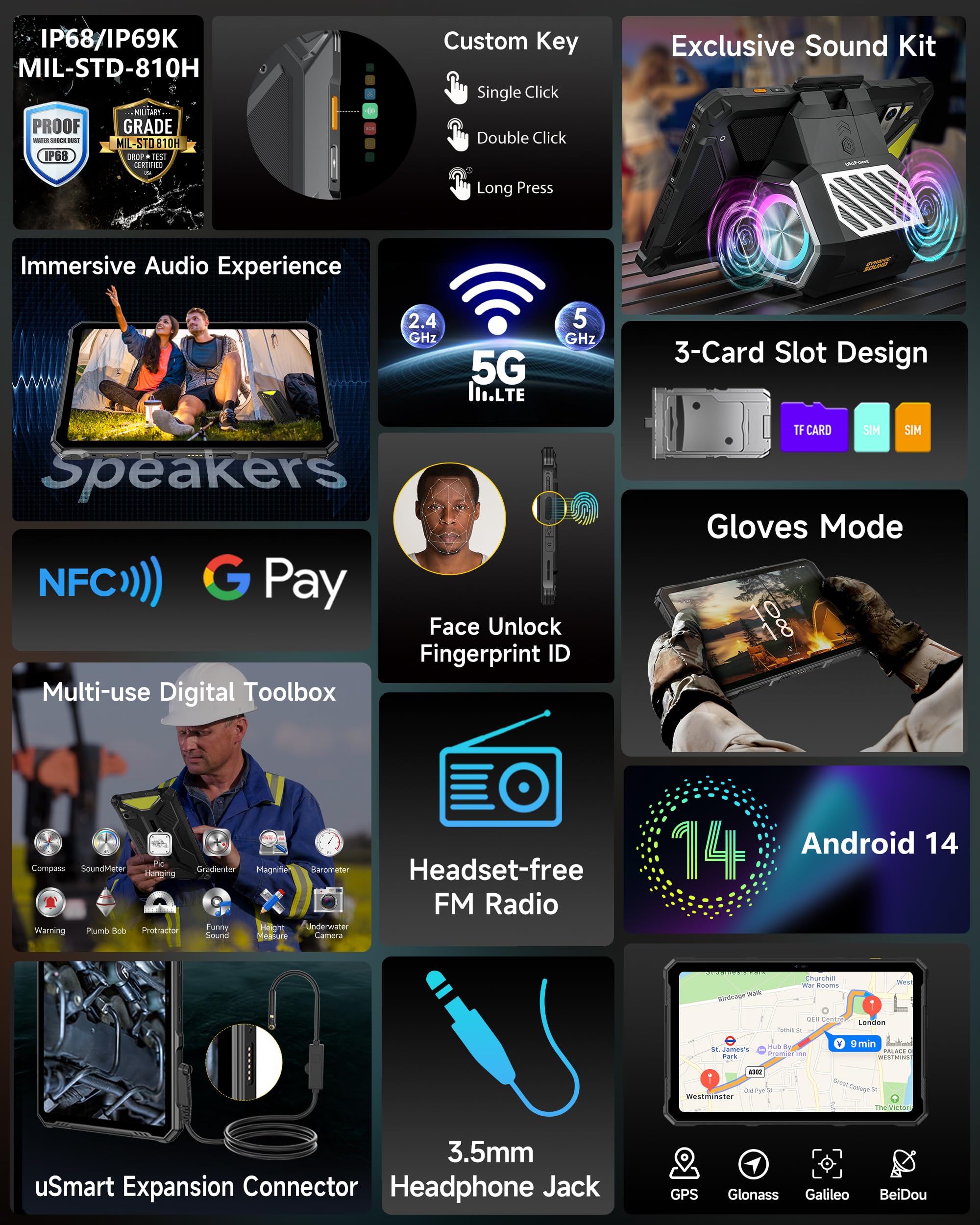 💙【MTK 6300 + 5G LTE Dual SIM】 Ulefone Armor pad 4 Ultra outdoor tablet is equipped with a MTK 6300 processor and a fully upgraded Android 14, which has faster and more efficient performance and can run smoothly even during multitasking. It also supports dual Nano SIM Cards or 1 Nano SIM Card + 1 SD Card.this tablet offers seamless connectivity with T-Mobile and Metro PCS.Note: NOT compatible with AT&T,Cricket,Sprint,Boost Mobile,or CDMA carriers like,finity,Straight Talk,U.S. Cellular.