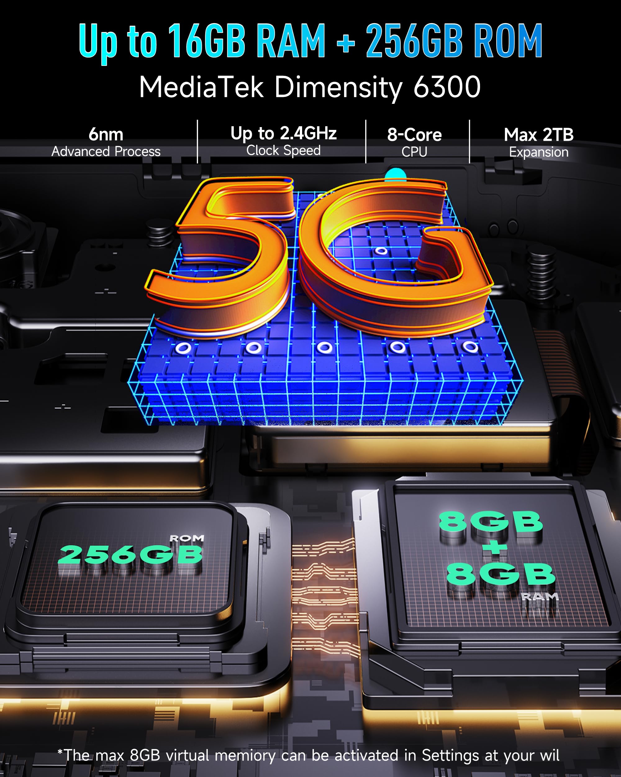 🚀【Up to 16GB RAM + 256GB ROM + Android 14】Features 8GB of RAM + 8GB Virtual RAM,plus 256GB of internal storage and 2TB expansion storage. MTK Dimensity 6300 chipset brings 2 x Arm Cortex-A76 CPU,2.4GHz frequency,6nm production process,along with ARM Mali-G57 MC2 GPU, and Android 13 OS making Ulefone Armor Pad 4 Ultra waterproof tablet perform fluidly and smoothly.