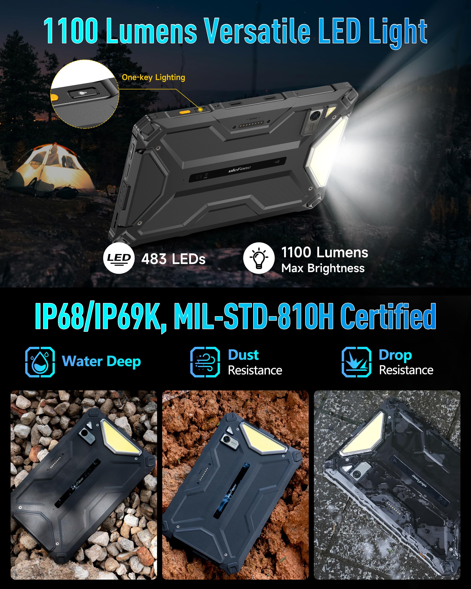 ❤️【1100 Lumens Powerful Camping Light】The Ulefone Armor Pad 4 Ultra Tablet can be used as a multifunctional lightingtool that serves as a flashlight,headlight,or portable camping light thanks to its built-in LED lights is one key to access the light.