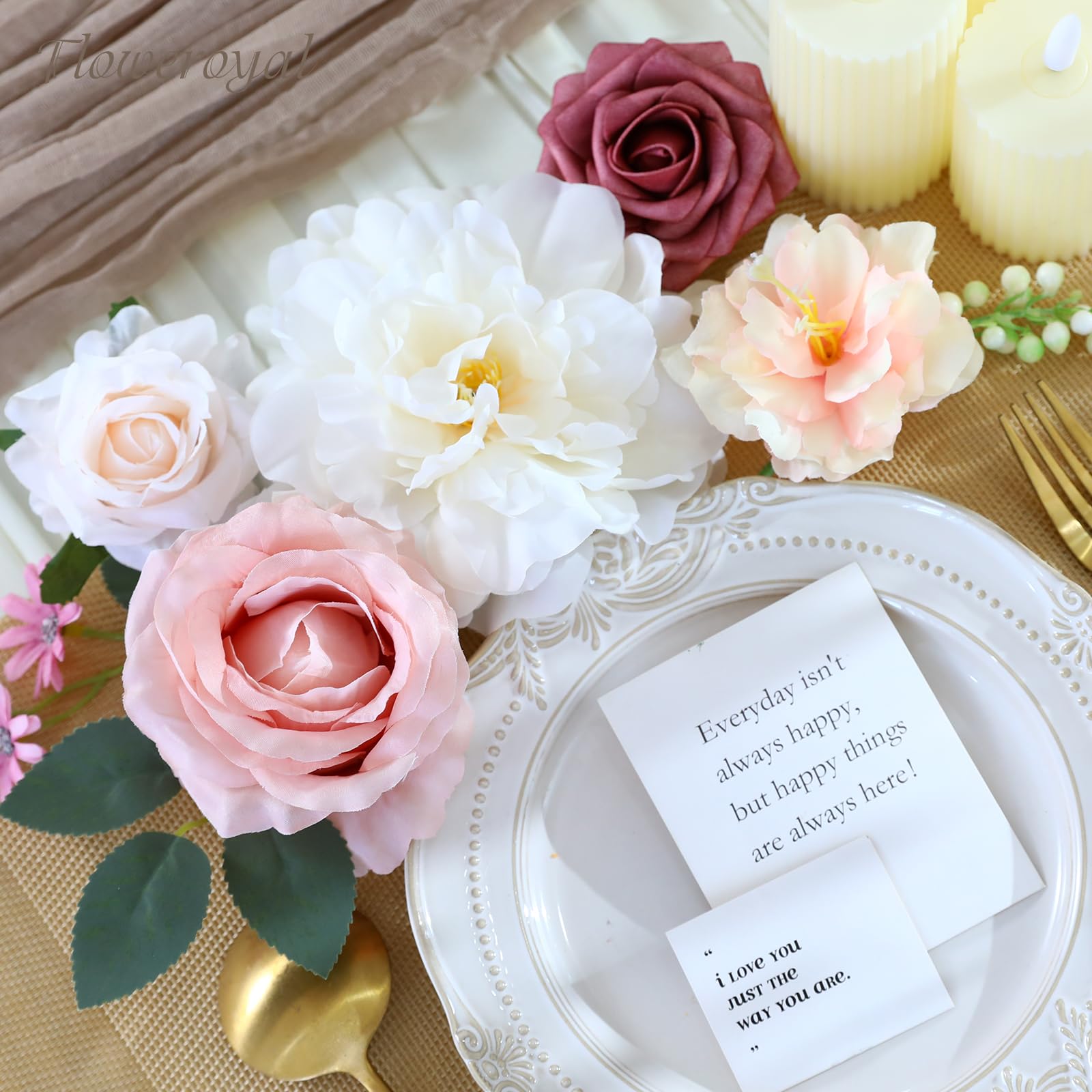 ♔EASY TO DIY & CARE-Floweroyal fake flower is a box of pre-selected flowers by color, size and type. If you don't know how to make flower arrangements, we have picked out all the right kind of flowers for you to create. Our flexible plastic flower stems have built-in iron wires. It's very easy to stick in flower mud to arrangements or bend for DIY. Do not have to water and no dead leaves. Easy to clean and remove the dust. Not easy to fade. Easy to store for a long time and use repeatedly.