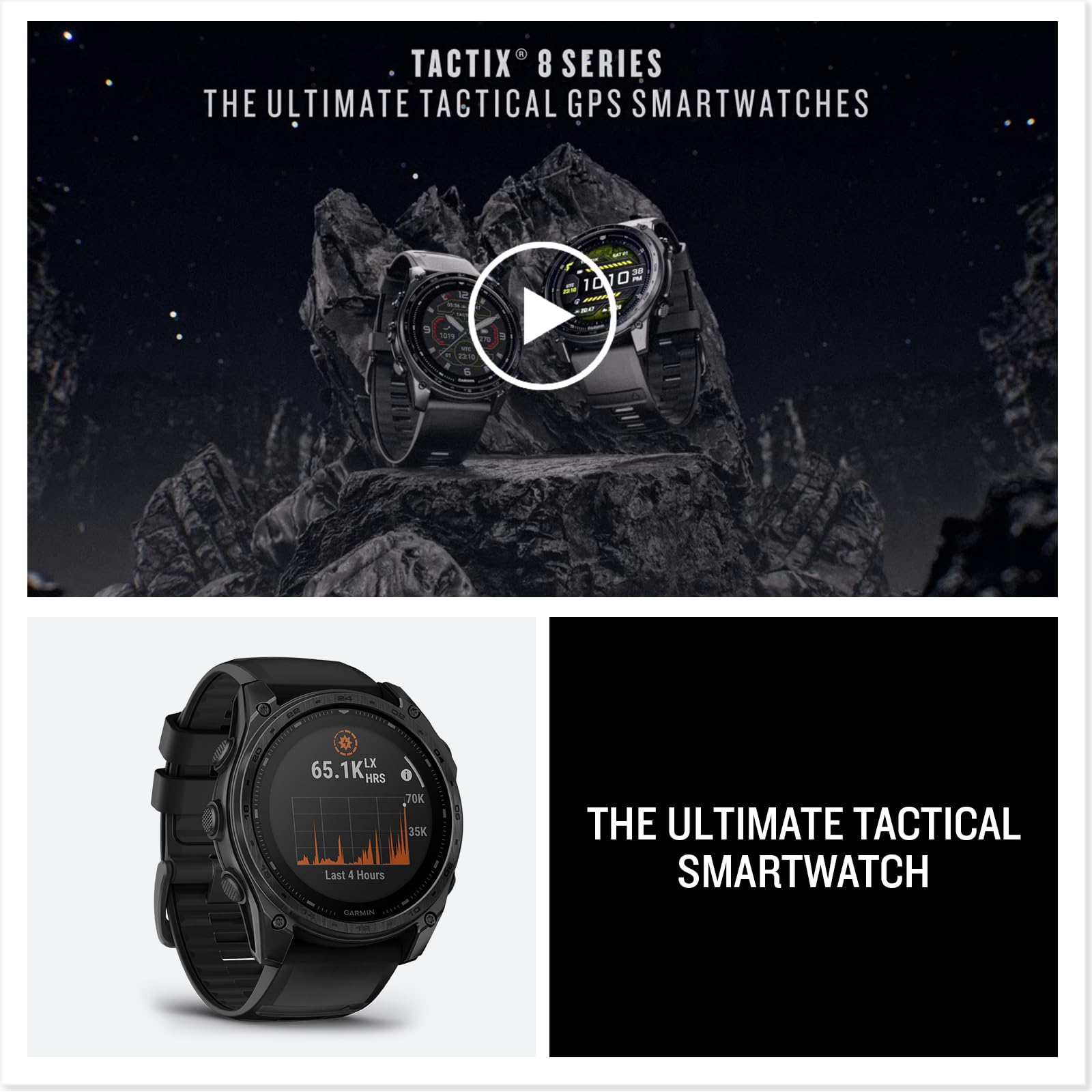 Rise above with tactix® 8. It’s the ultimate tactical smartwatch, featuring a solar charged display, titanium bezel, sapphire lens and a 40-meter dive rating. Pair with your smartphone for on-wrist calling with the built-in speaker and mic. Dedicated tactical features include a rucking activity and advanced unlocked Applied Ballistics Elite® solver along with a jumpmaster activity, waypoint projection, stealth mode, kill switch and more. Guide the mission with a built-in LED flashlight. Train like never before with strength training plans, sport-specific workouts and daily suggested strength workouts for runners and cyclists. Navigate the outdoors with superior positioning accuracy, thanks to multi-band GPS with SatIQ™ technology plus built-in sensors for the 3-axis compass, gyroscope and barometric altimeter. Push harder with up to 48 days of battery life in smartwatch mode (assumes all-day wear with 3 hours per day outside in 50,000 lux conditions).