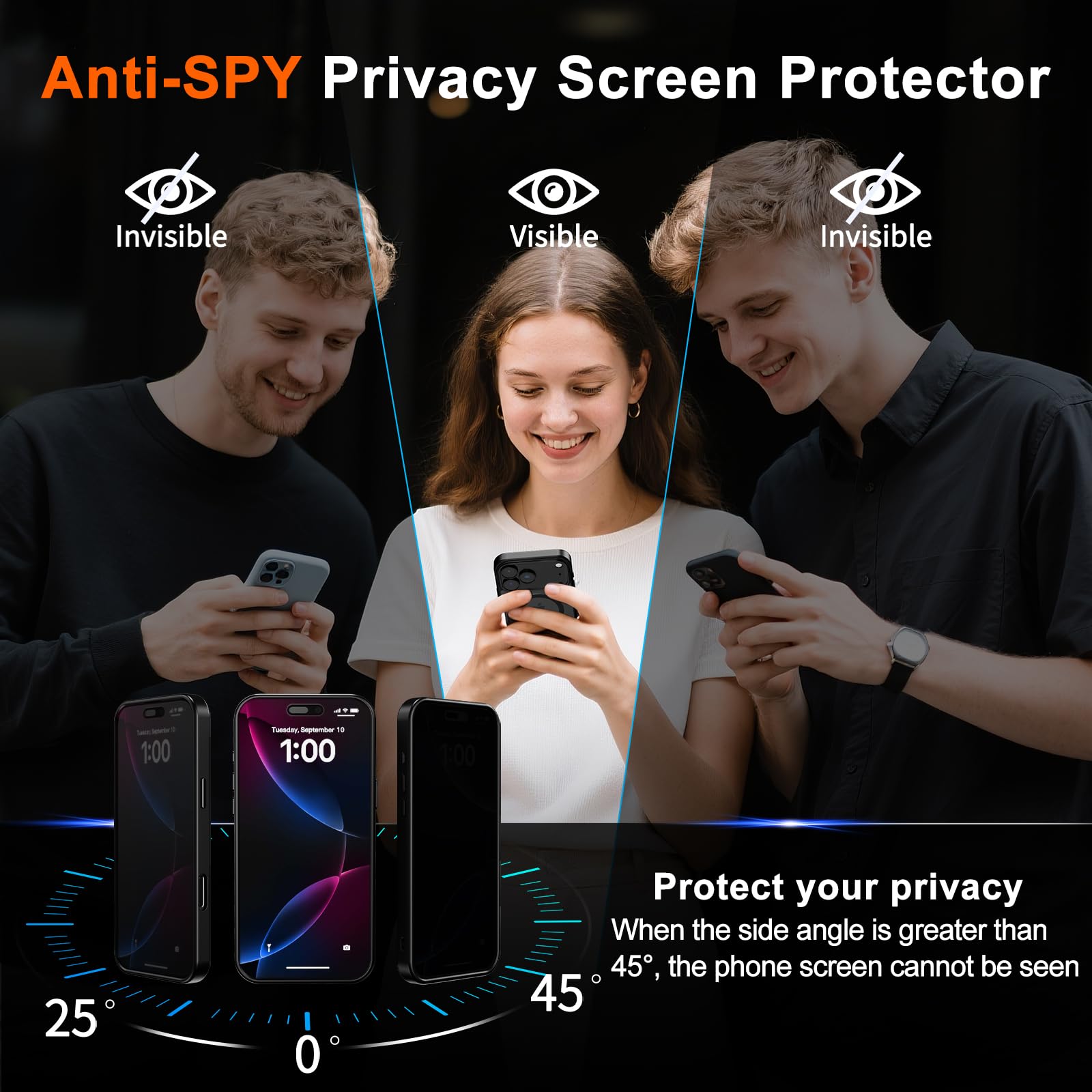 [Anti-Spy Screen] Privacy case for iPhone 17 Pro protect privacy and screen, when facing screen at 90°, screen content is clearly visible, when facing above 45°, screen content not visible, It can effectively protect your privacy when you open your phone in a crowd.