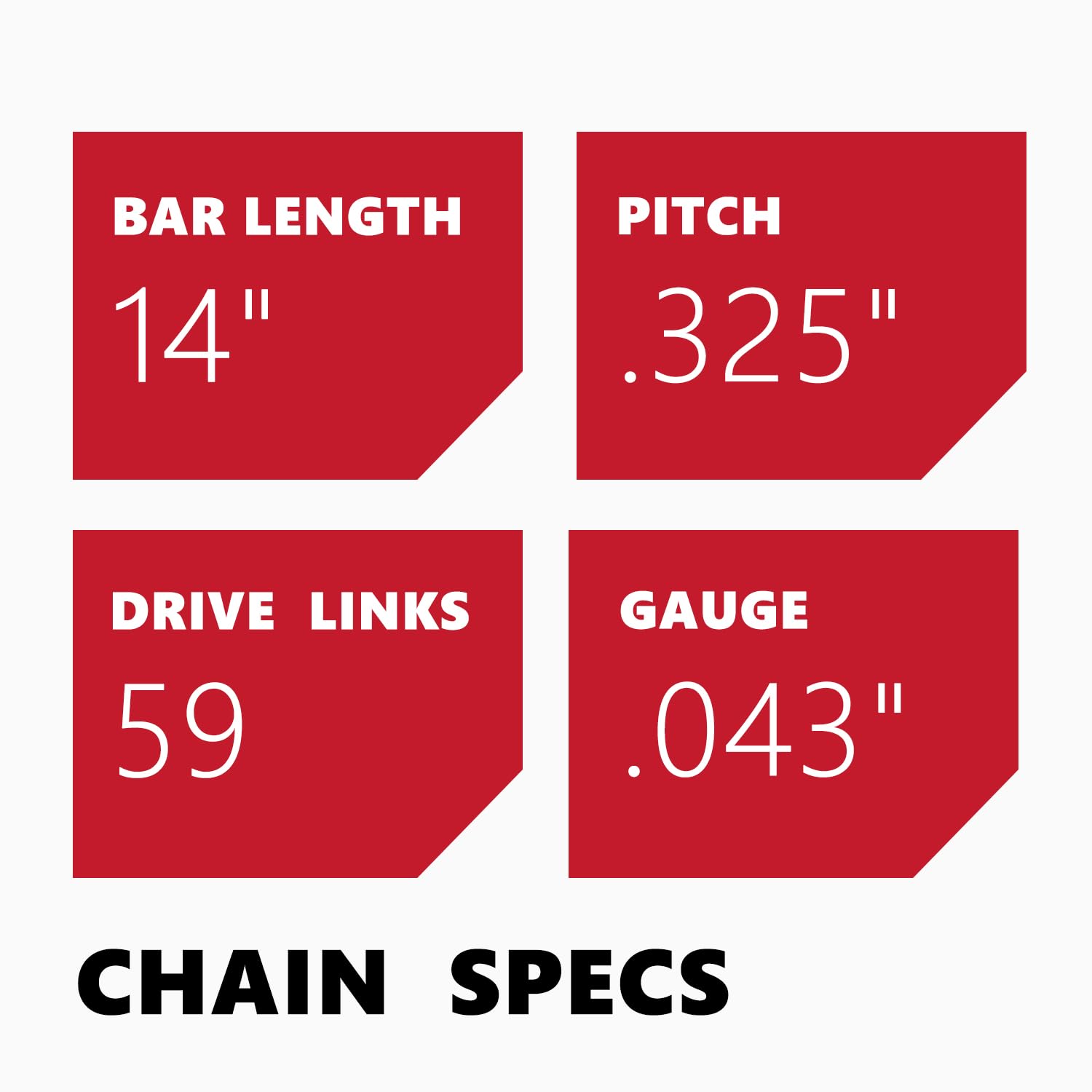 【SPECIFICATIONS】 3 Pack 14 Inch, .325" LP Pitch, .043" Gauge, 59 Drive Links, semi-chisel. This saw chain met the kickback performance requirements of ANSl B175.1-2012 when tested according to the provisions of ANSl B175.1-2012. Low kickback saw chain meets the kickback performance requirements of CSA Standard Z62.3.