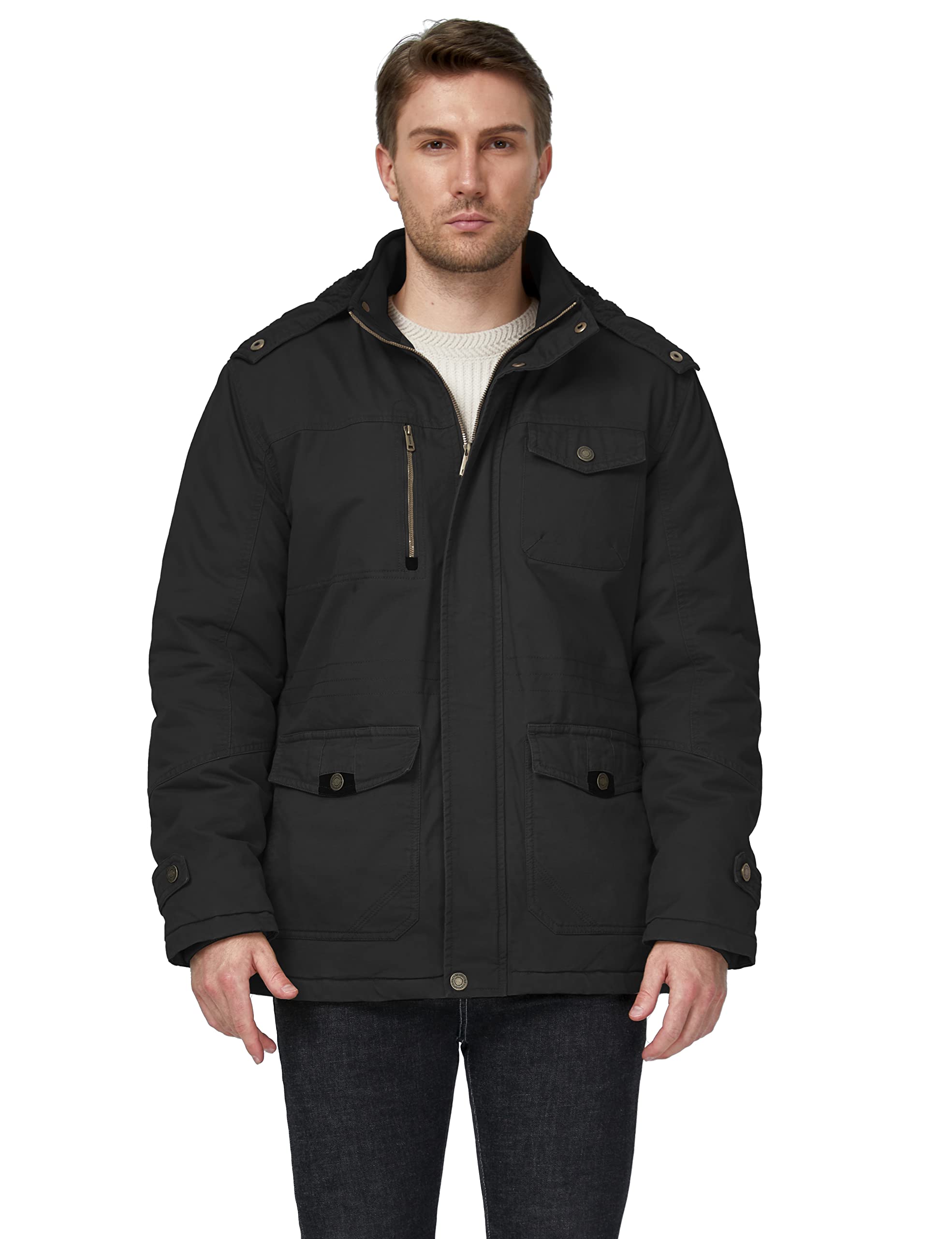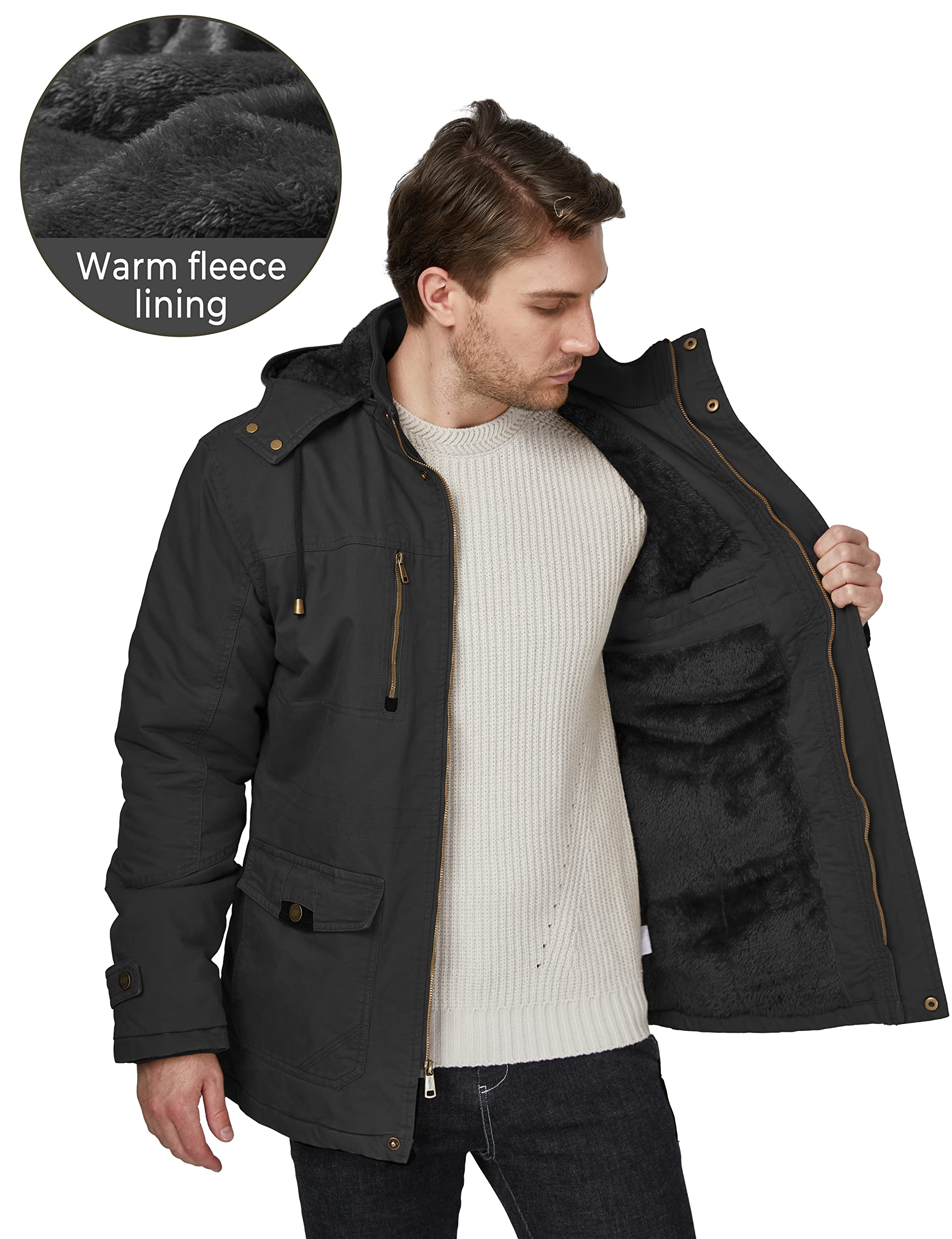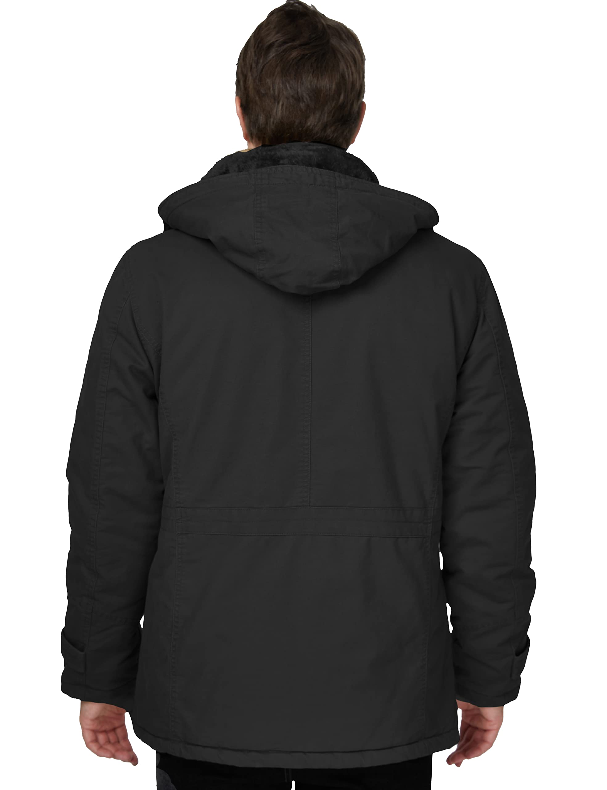 Cloak yourself from the cold in this comfy parka - High density washed pure cotton fabric and thick fleece lining and length make this hip-length jacket your barrier against harsh conditions, keeping you warm and providing maximum wind protection in all directions.