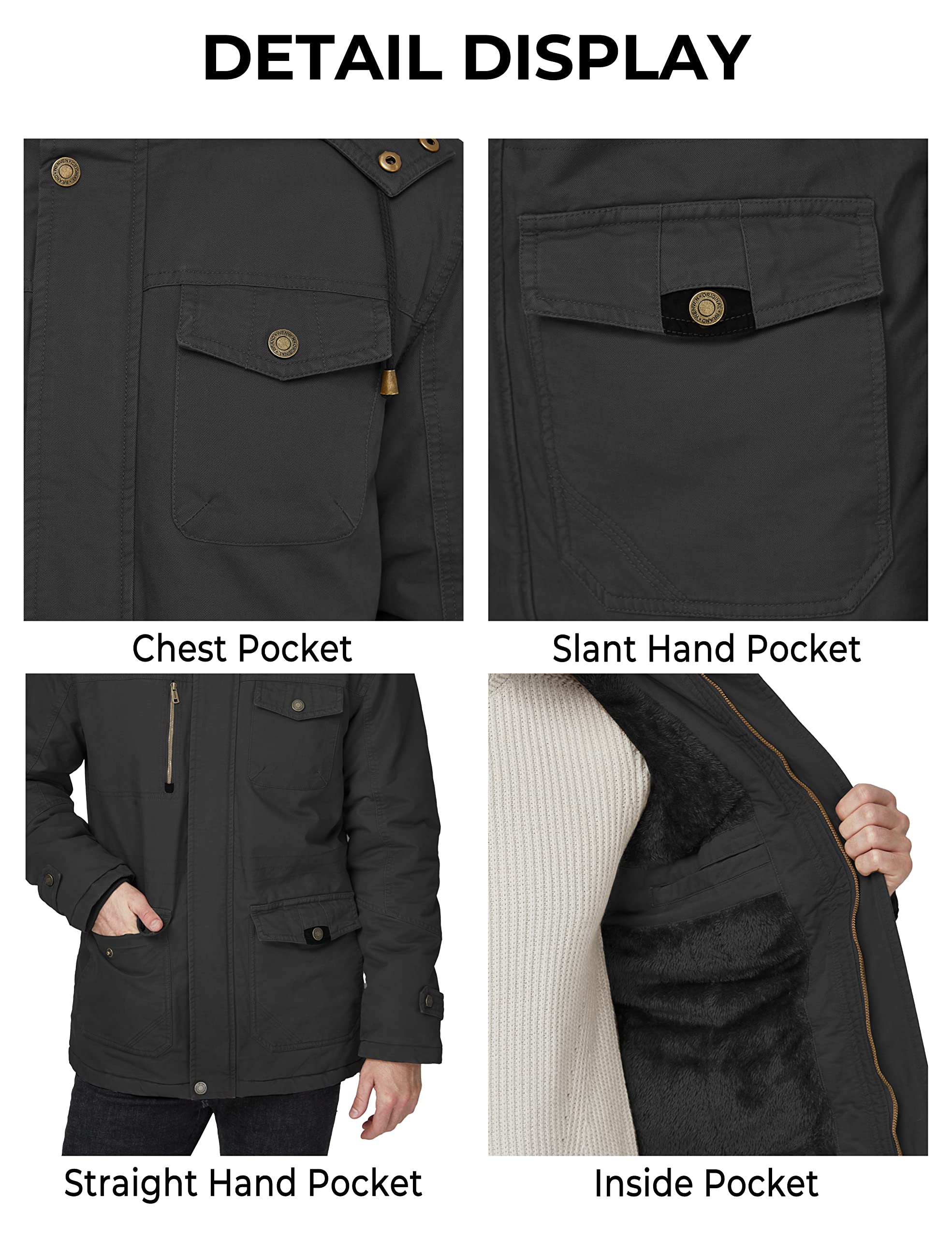 Superior material - All the zippers and buttons are replaced by the new ones, which are more firmly and stable after the thousands test. And the lining of pockets and sleeves are replaced by thicker and higher density fabric.