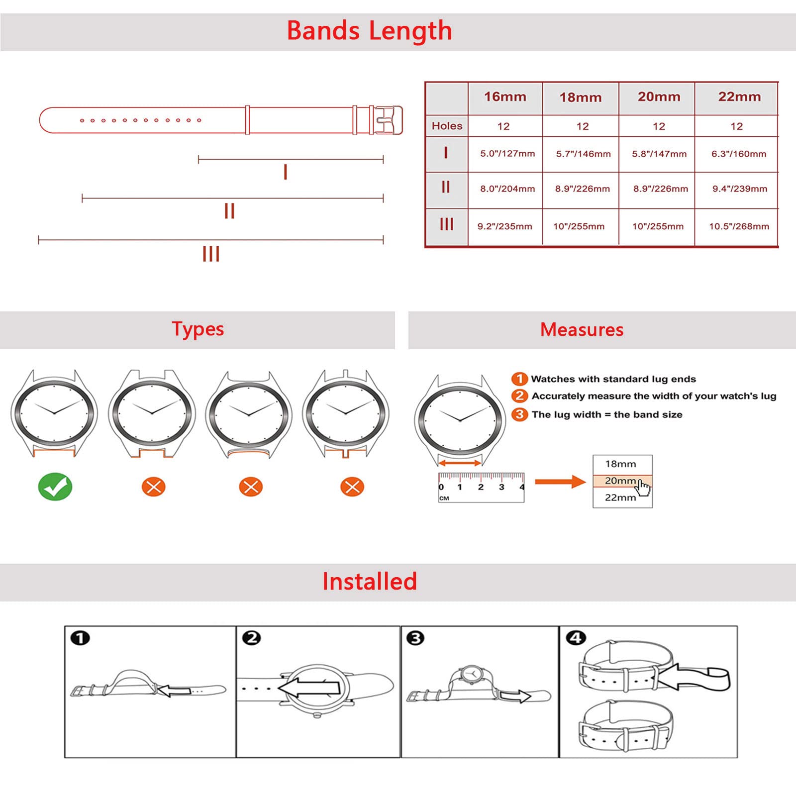 Select Width: Available in 16mm ,18mm, 20mm, 22mm widths to fit most of watch models. To determine proper width for your watch, use a metric ruler to measure the lug width or the width of the current band at the point where it attaches.