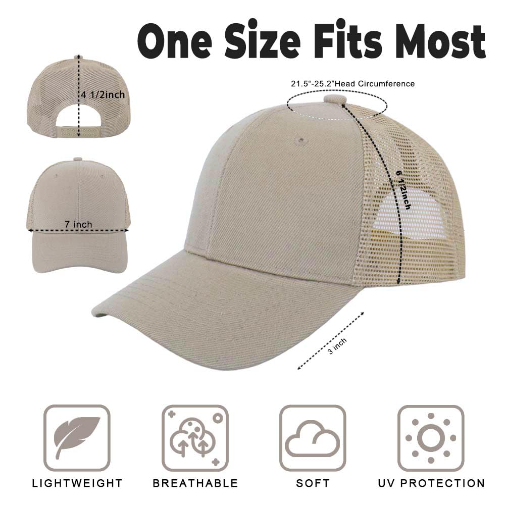[Comfortable & Lightweight ]: Made from a durable blend of polyester and mesh fabric, our hats are lightweight and comfortable. The front panel and breathable mesh back ensure excellent ventilation , while the brim offers UV protection, making them ideal for outdoor activities.