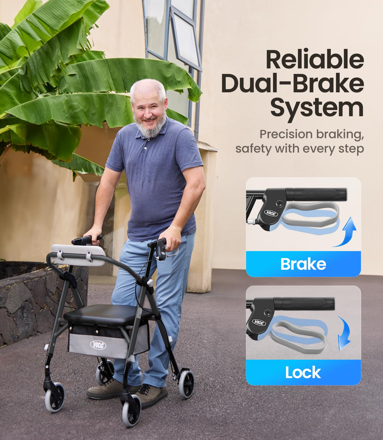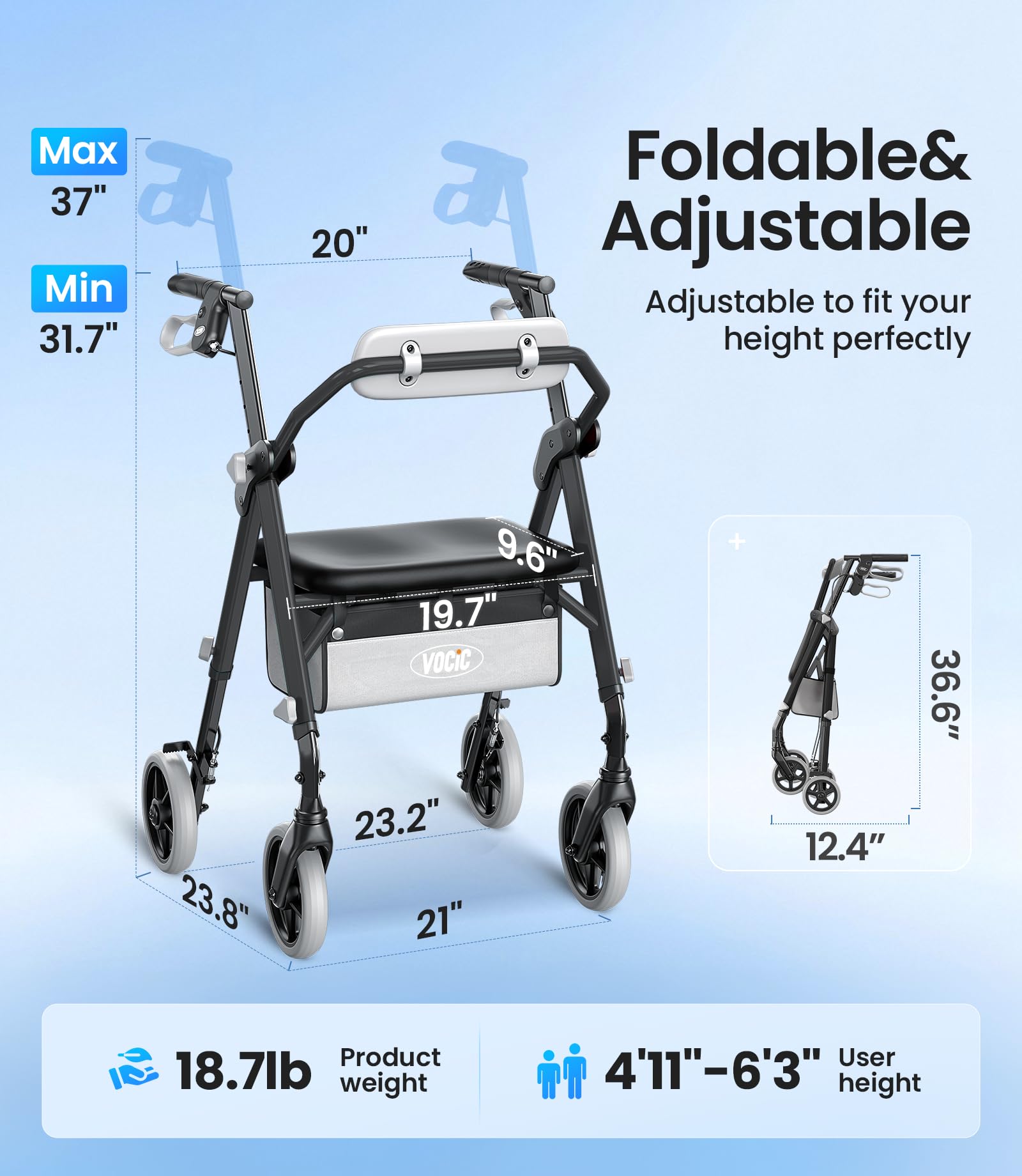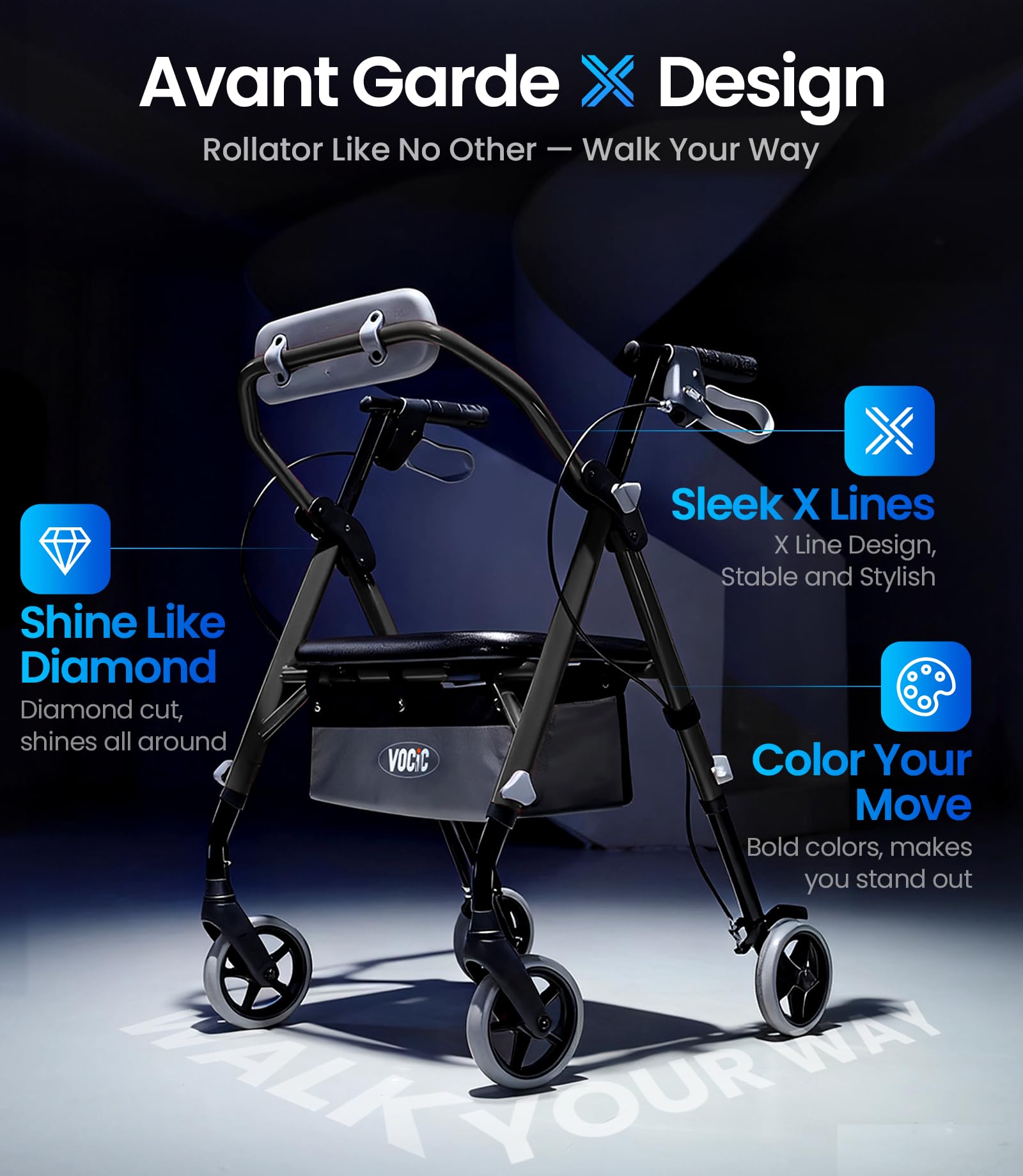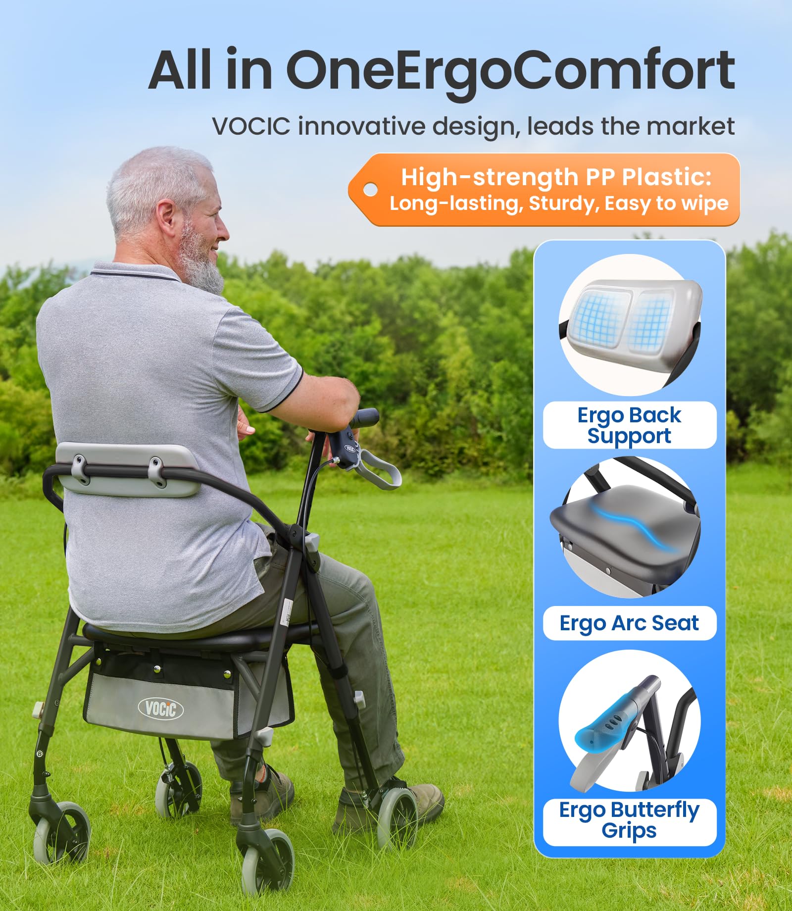 【All-in-One ErgoComfort】VOCIC walker features innovative Ergo Cushion, Curved design offers zero pressure. Ergo Dual-arc Back Support, provides firm and reliable back support. Ergo Butterfly Grips, wrist friendly, effortless braking.The triple-link system is scientifically designed to deliver all-day comfort with every second.