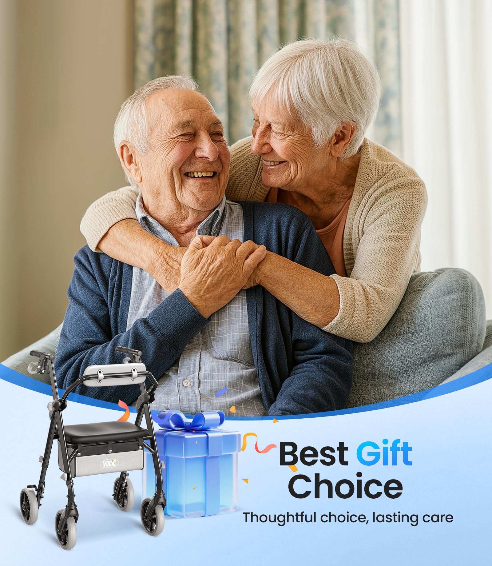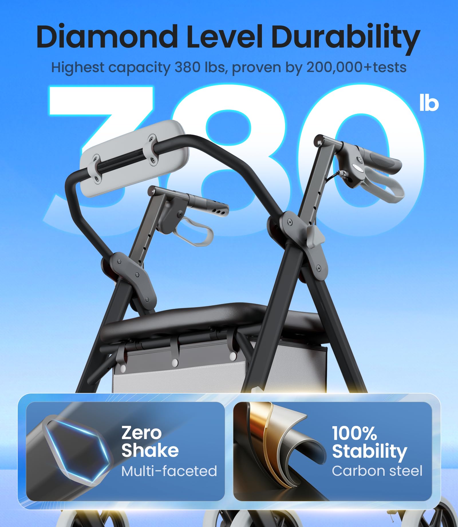 【380lbs Highest Stability】Engineered with Multi-faceted cut tubing locks firmly in place, paired with a carbon steel mult-triangular frame structure that withstands over 200,000 high-impact tests. Zero Shake,100% Stability.Supports up to 380lbs, far outclassing similar rollator walker on the market.
