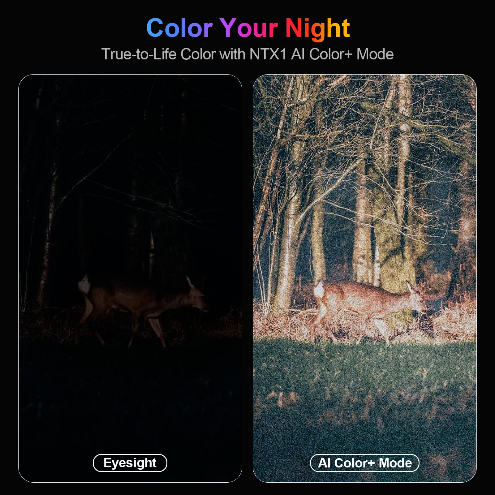 【AI Color+ & Infrared Night Vision】 Experience true-to-life full-color night vision with AI Color+ in any low-light setting. 4 levels of 850nm infrared reveal details for wildlife spotting, or camping