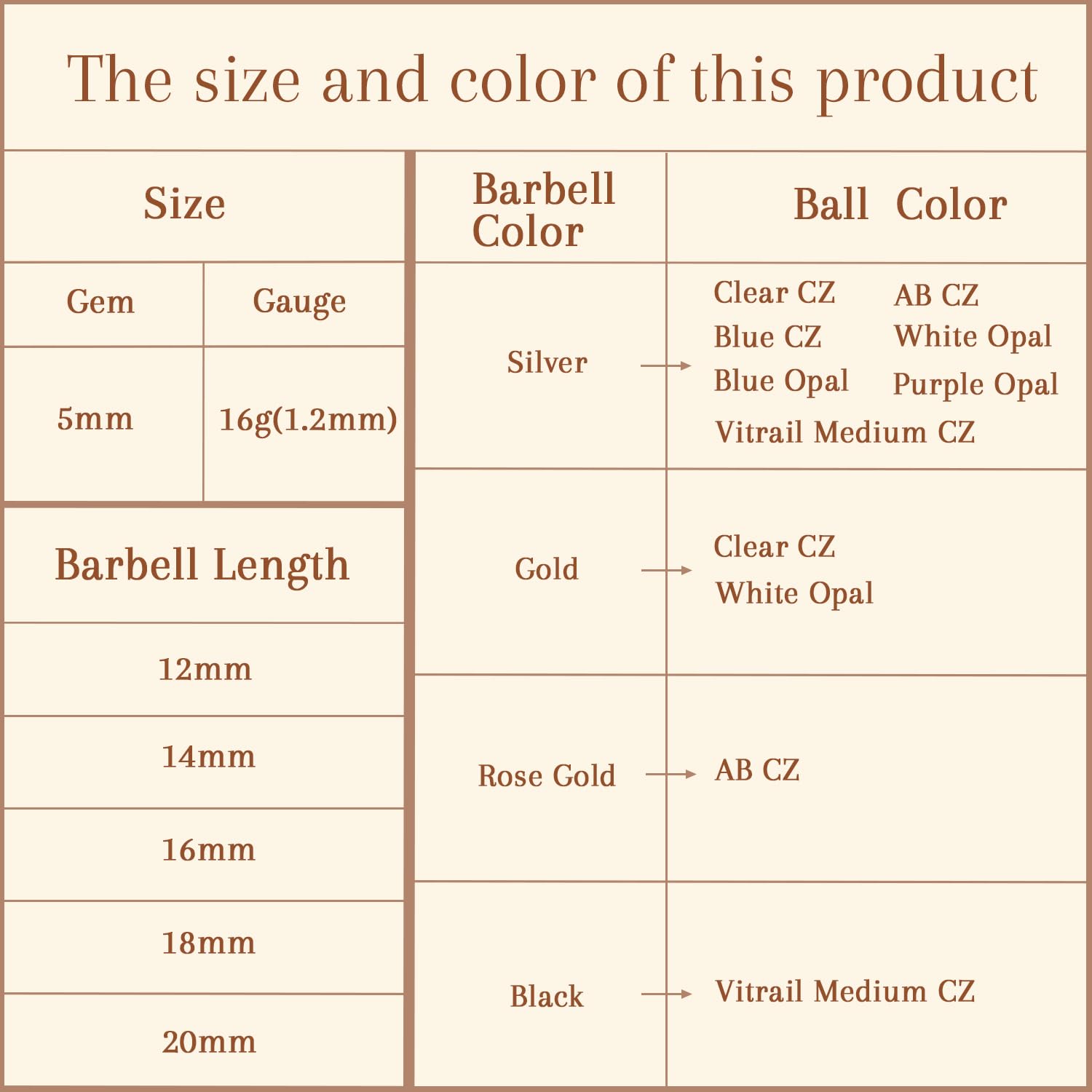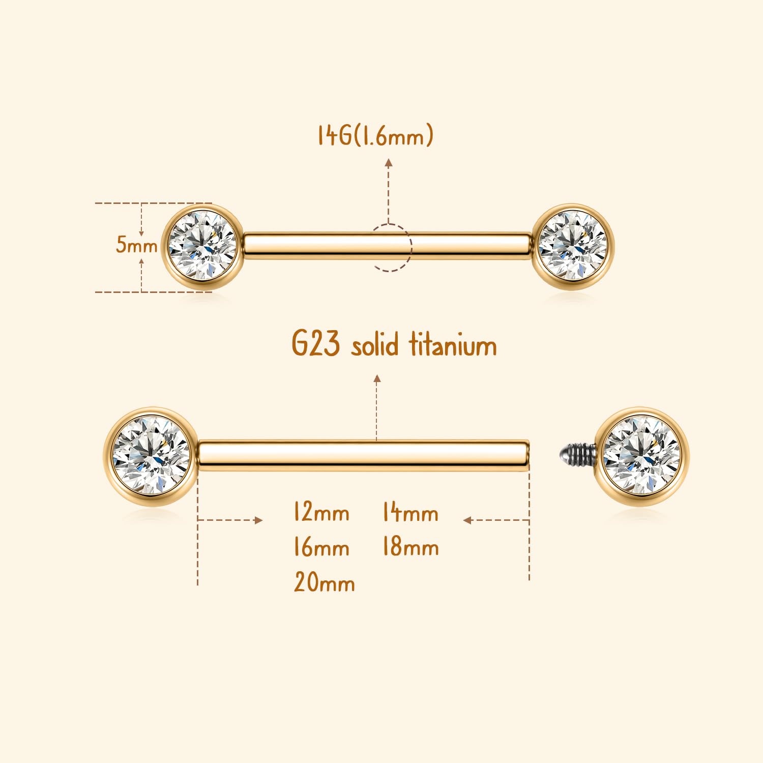 Size and Color:Gauge:14g nipple rings,Nipple Barbell Length:1/2"(12mm) CZ Size:5mm.Color: Gold+Clear CZ