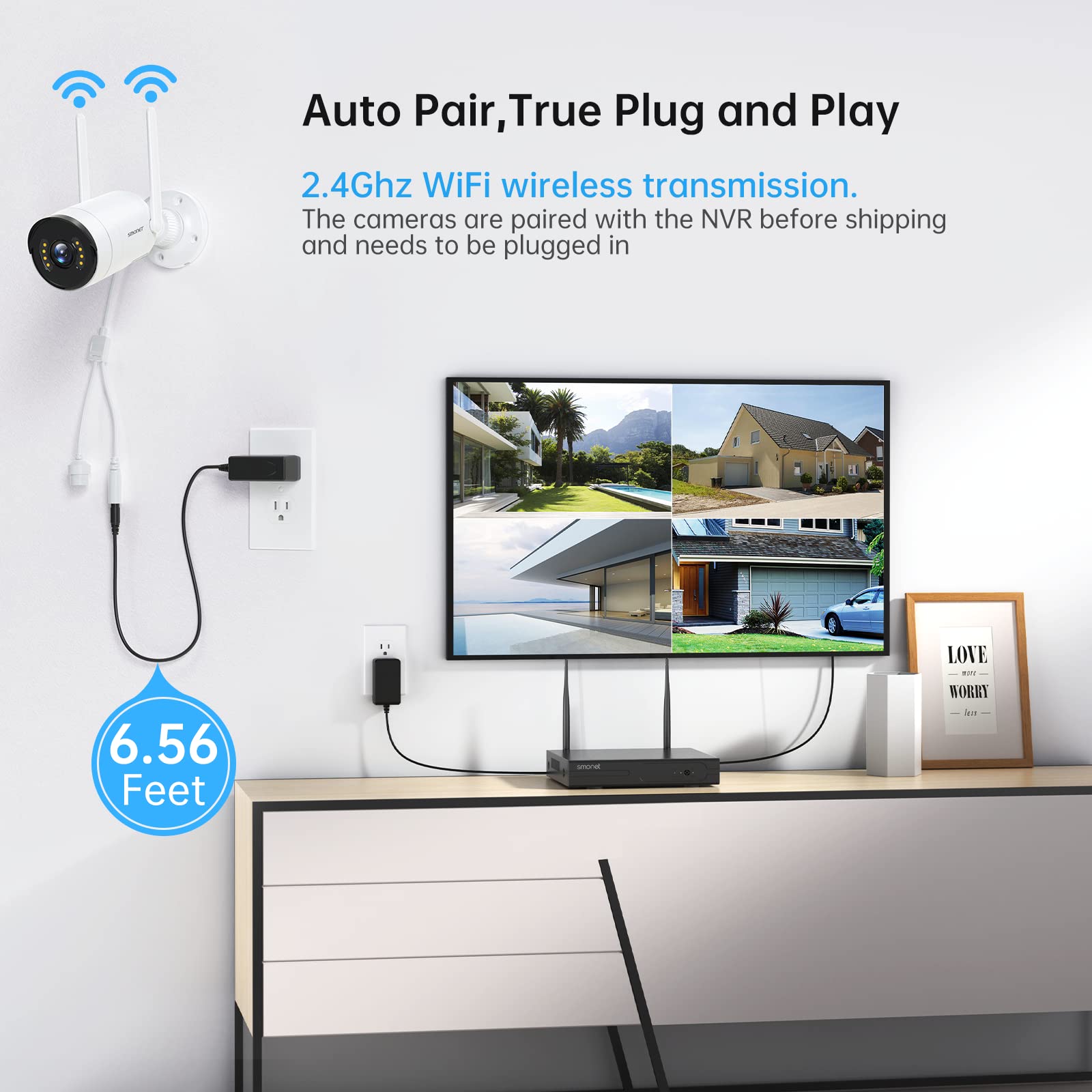 Easy Setup and Plug&Play: 3MP wireless cameras and NVR had been matched before delivery.The CCTV camera security system wireless is easy to set up and DIY installation. Connect PC/TV monitor to NVR by a VGA/HDMI cable.Connect each camera to the power supply provided, video is on,true plug and play.Perfect for villa,home,office,shop,hotel,warehouse,school and business. All cameras need to be plugged in the power supply/outlet for 24/7 surveillance.(SMONET doesn't take charge of installation).