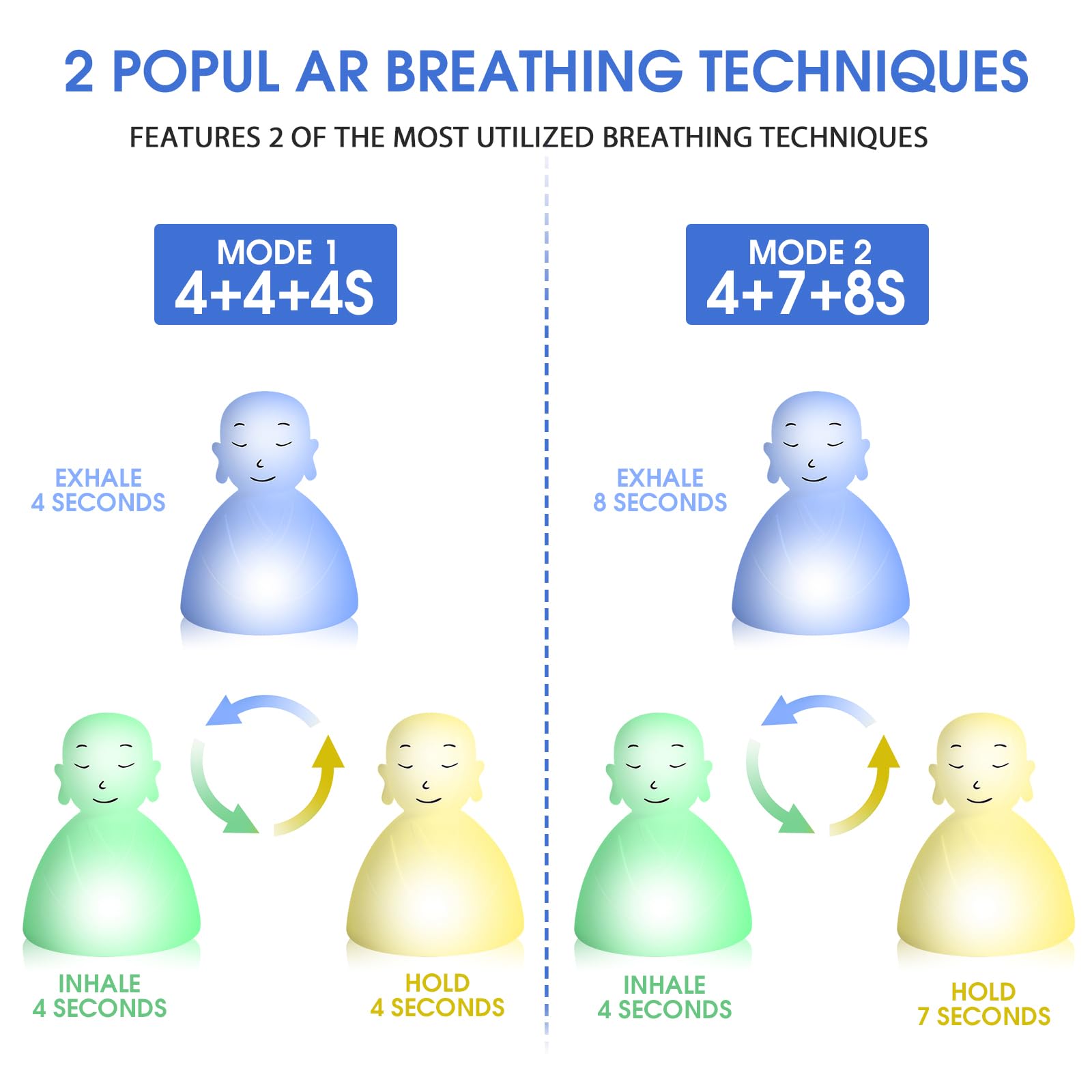 Two breathing modes: The breathing lamp is two breathing modes, one is 4-7-8s, and the other is 4-4-4-4s mode. Includes green, yellow, blue, three colors automatically change