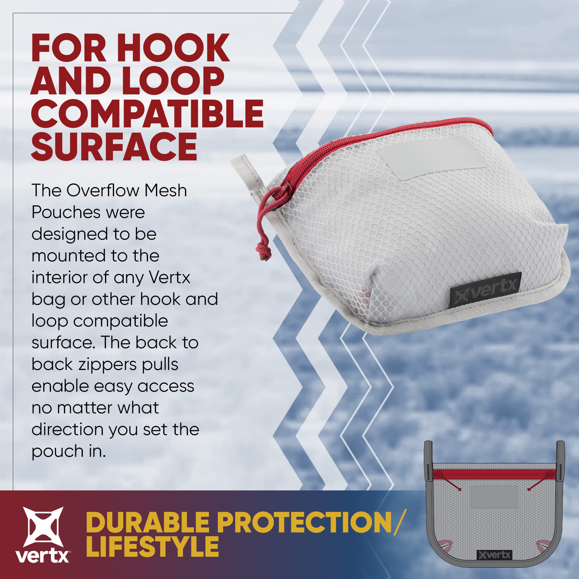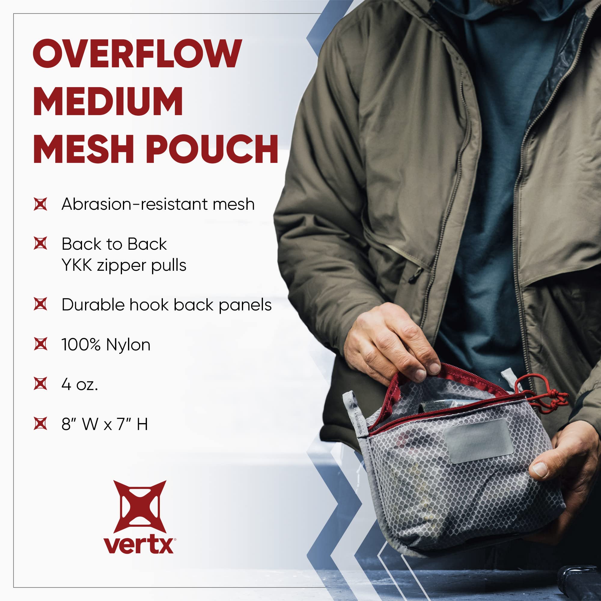 Description The Overflow Mesh Pouches were designed to be mounted to the interior of any Vertx bag or other hook and loop compatible surface. The back to back zippers pulls enable easy access no matter what direction you set the pouch in. The abrasion-resistant mesh provides durable protection and fast visual identification of stored items. The small mesh pouch is ideal for smaller medical essentials, charging cables, ear plugs, glasses, small tools, and other small items.