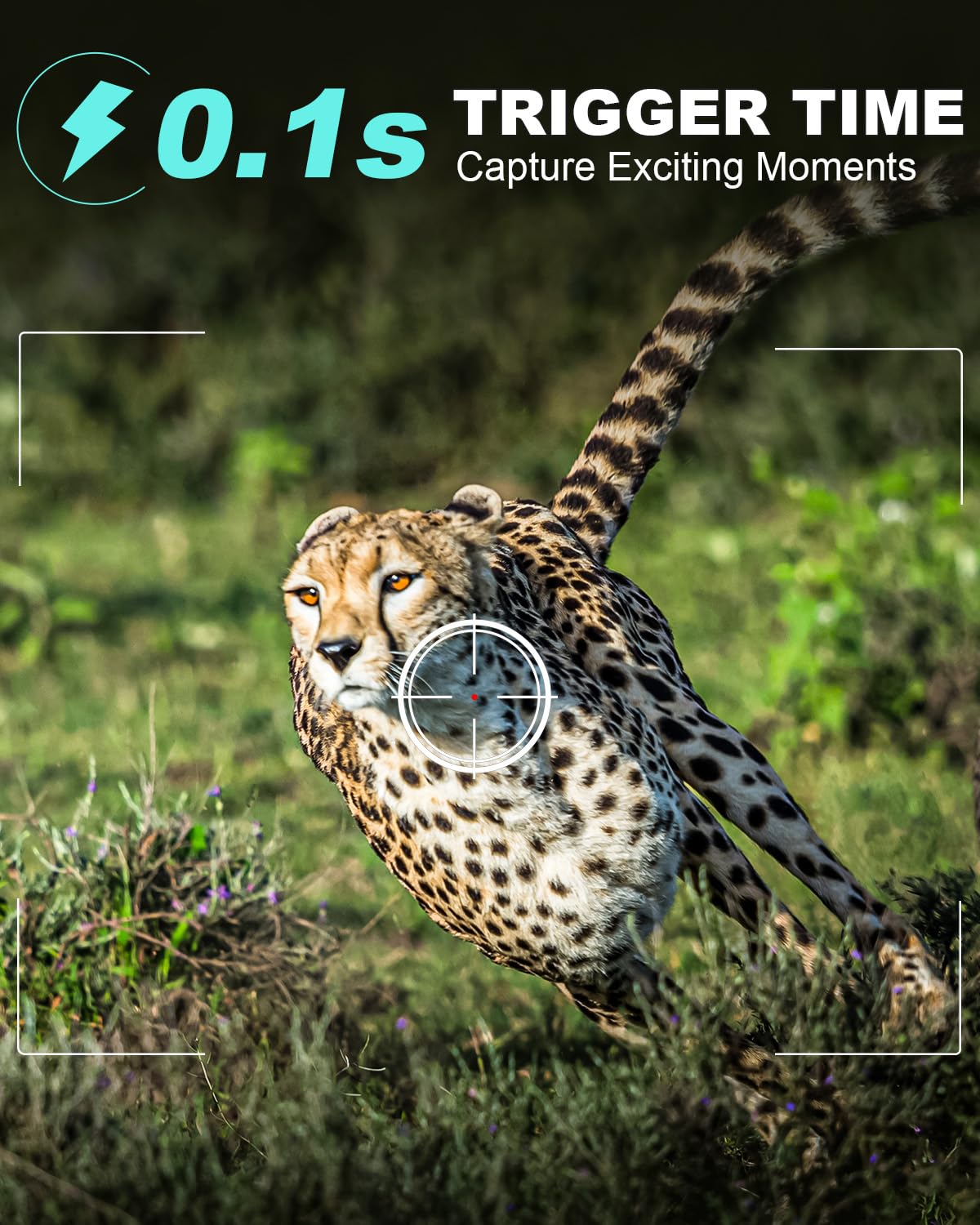 【Fast 0.1s Trigger Time &130°Wide Angle】Once movements are detected, the lightning-fast trigger speed of less than 0.1s with 1 to 5 shots choice guarantees fast and accurate capture of each detected motion exposed to the field, never miss any animals that wander by this camera. 130° detection range to give you an expansive field view, indispensable for hunting, wildlife observation, farm monitoring, home backyard, plant growth observation, property security and surveillance.