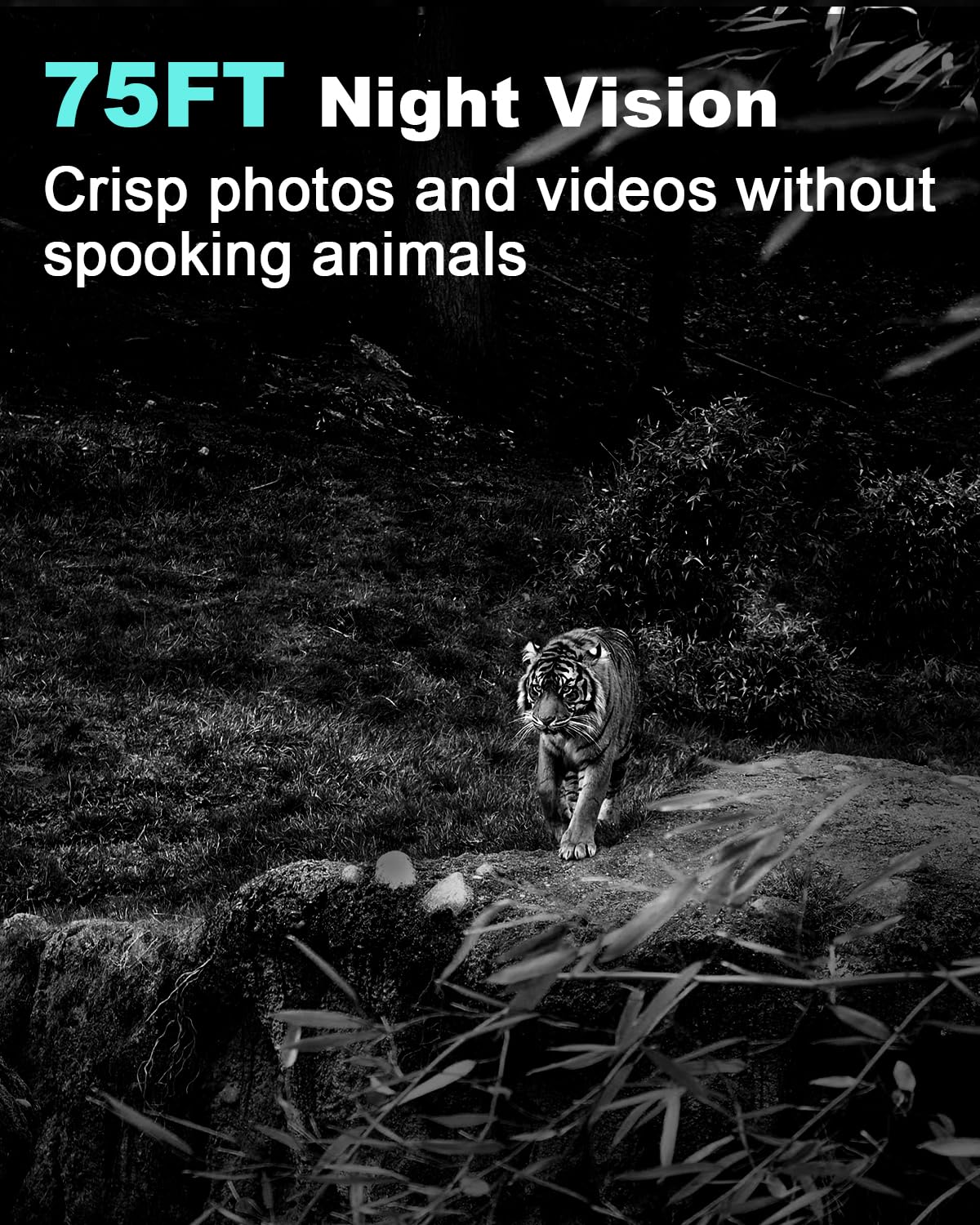 【Super Night Vision & Low Glow Infrared LEDs】The trail camera is equipped with powerful 22Pcs low glow infrared LEDs, features upgraded 850nm infrared technology, makes this game camera more stealth, which can show the night behavior of animals without disturbing them, encompasses adaptive illumination technology to avoid overexposure or over-dimmed, which can provide clear night images and videos in total darkness, delivers brilliant night vision up to 70ft.