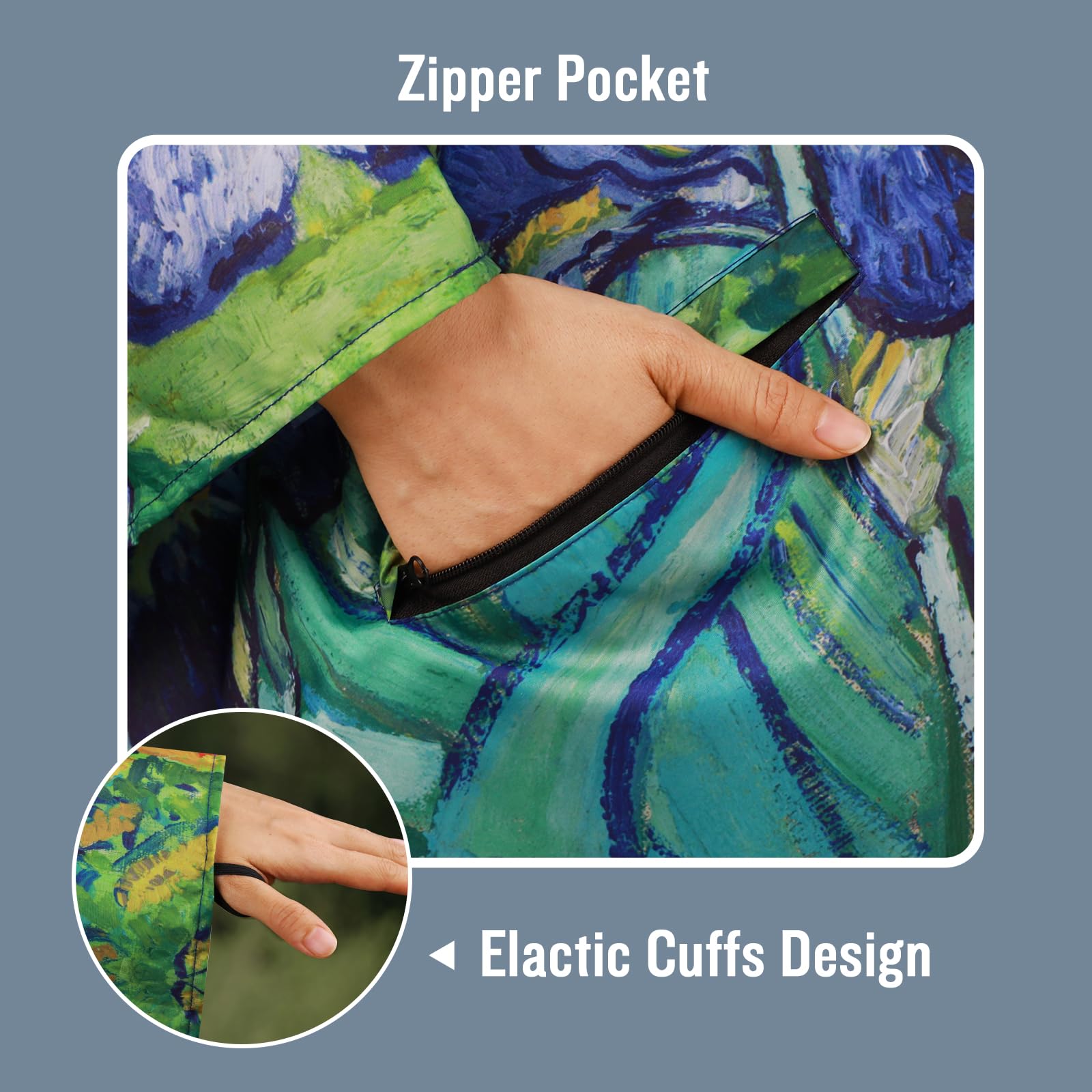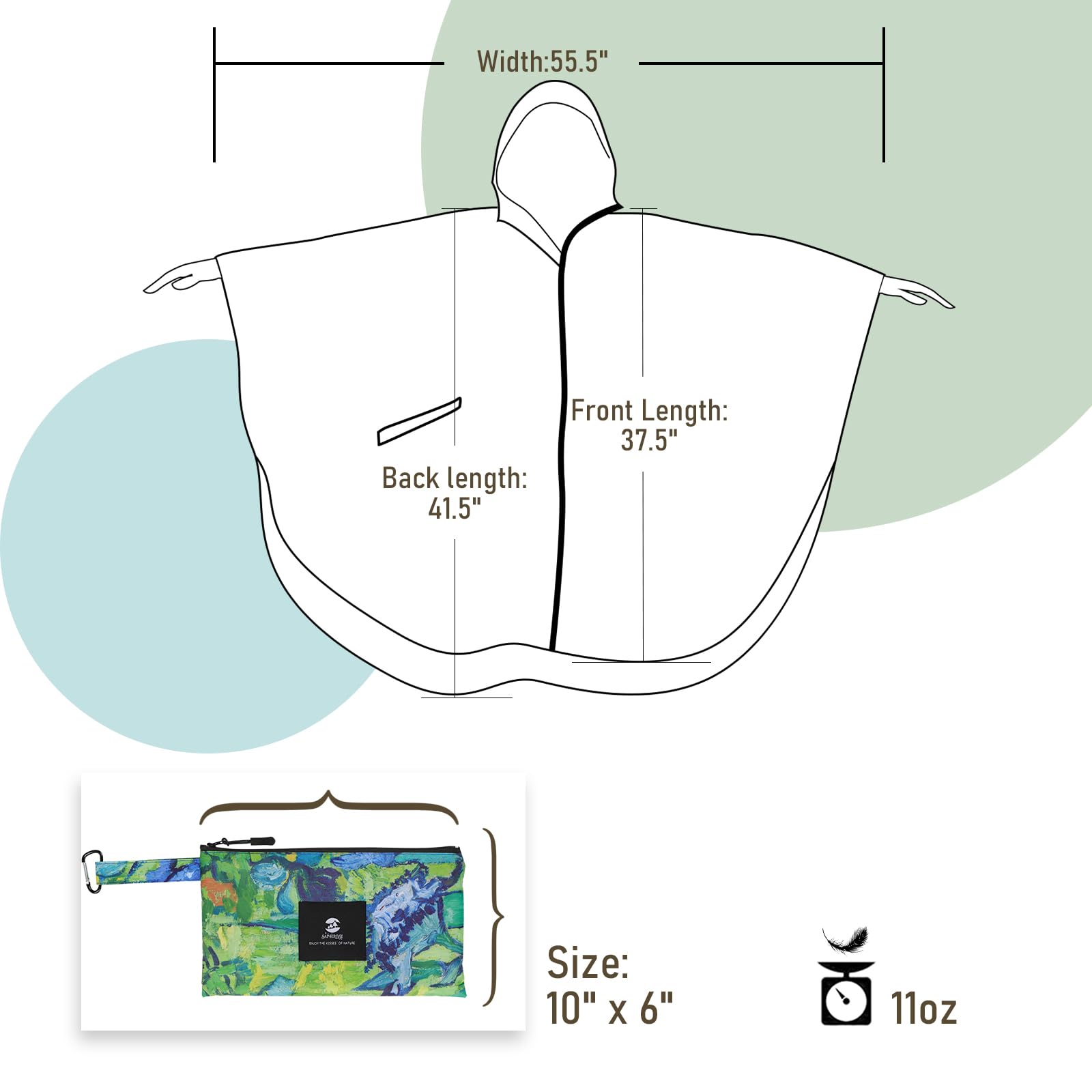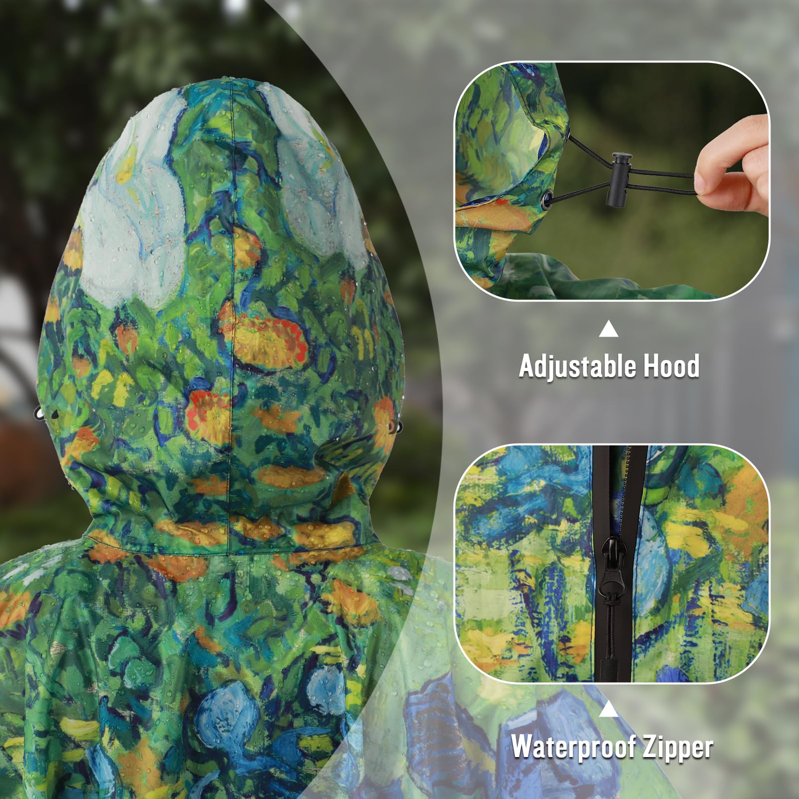 [Design]: Designed to be highly water-resistant and quick-drying, this poncho features a long body and a spacious hood with an adjustable elastic for a snug fit. For sizing details, refer to the provided information or contact us directly with any questions