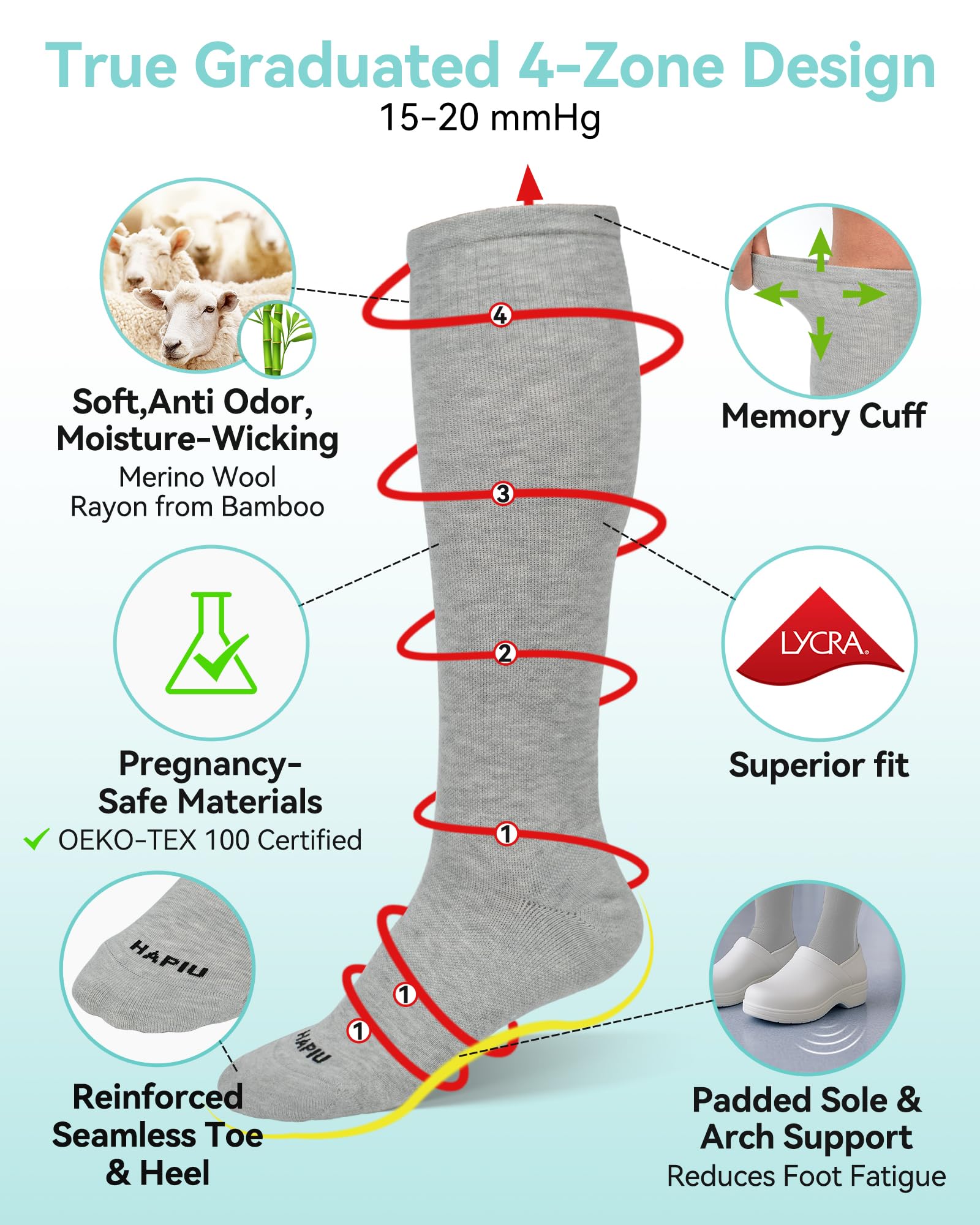 KEEP YOUR FEET FRESH: A blend of Merino wool and rayon made from bamboo, our support socks are ultra-soft, itch-free, anti-odor, moisture-wicking, thermoregulating, and breathable, providing all-season comfort