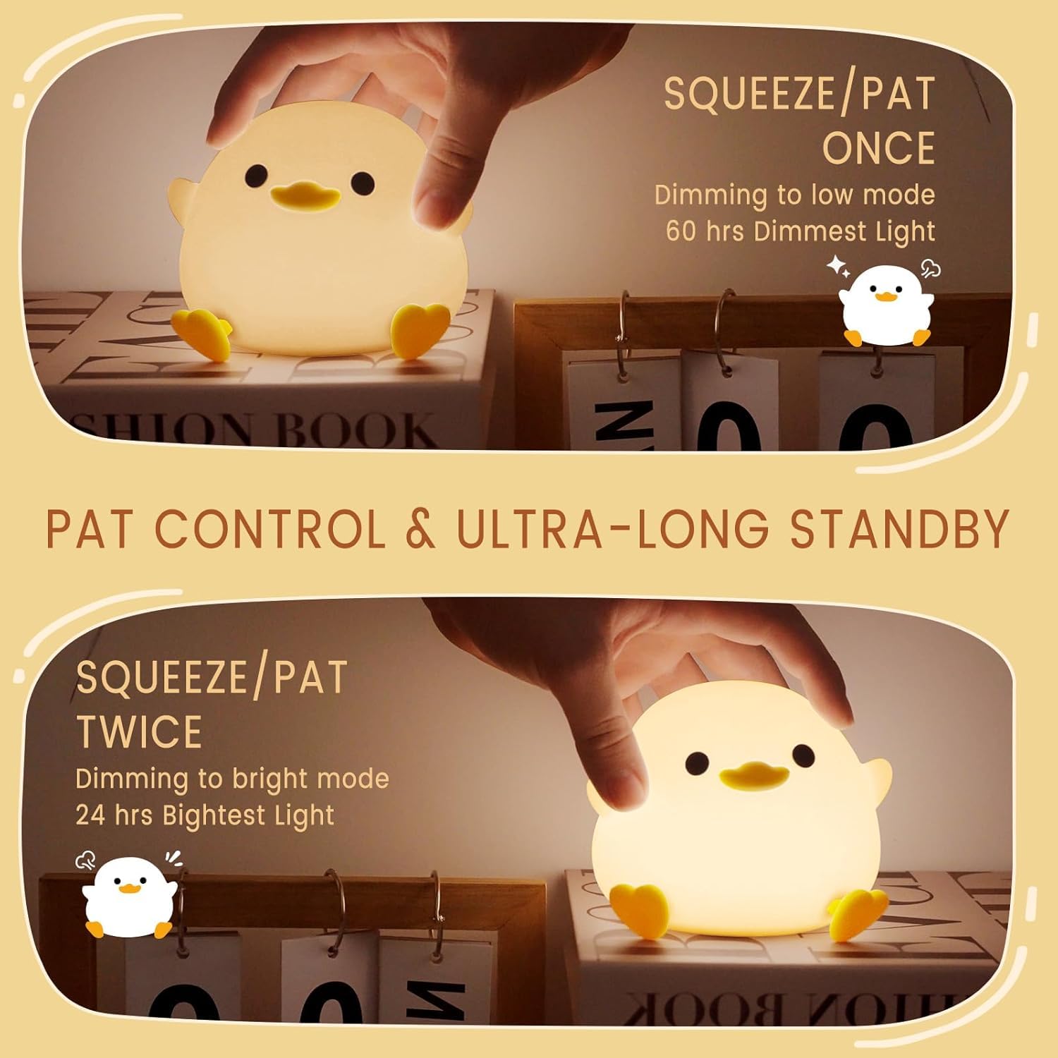 𝐃𝐢𝐦𝐦𝐚𝐛𝐥𝐞 𝐃𝐮𝐜𝐤 𝐂𝐮𝐭𝐞 𝐋𝐚𝐦𝐩𝐬: You can touch the lovely ducky night lights with 20 minutes timer choice, no need to manually shut it off. 2 levels different brightness settings: You can tap the dodo duck body to adjust the brightness of this cute lights in the weak and normal gear. Warm and soft lighting, let you sleep easily in a warm and cozy atmosphere. You can of course also use it during the day as a cute night light lamp or a decorative light for their room
