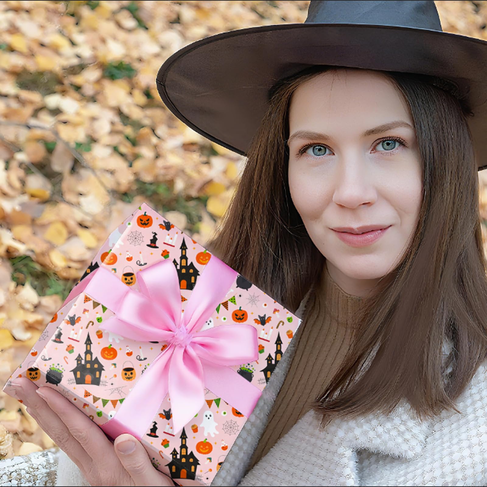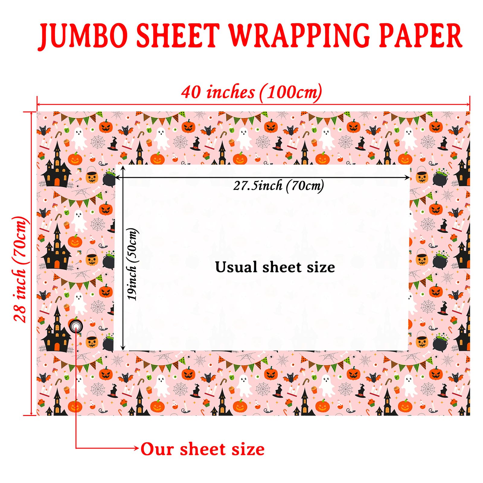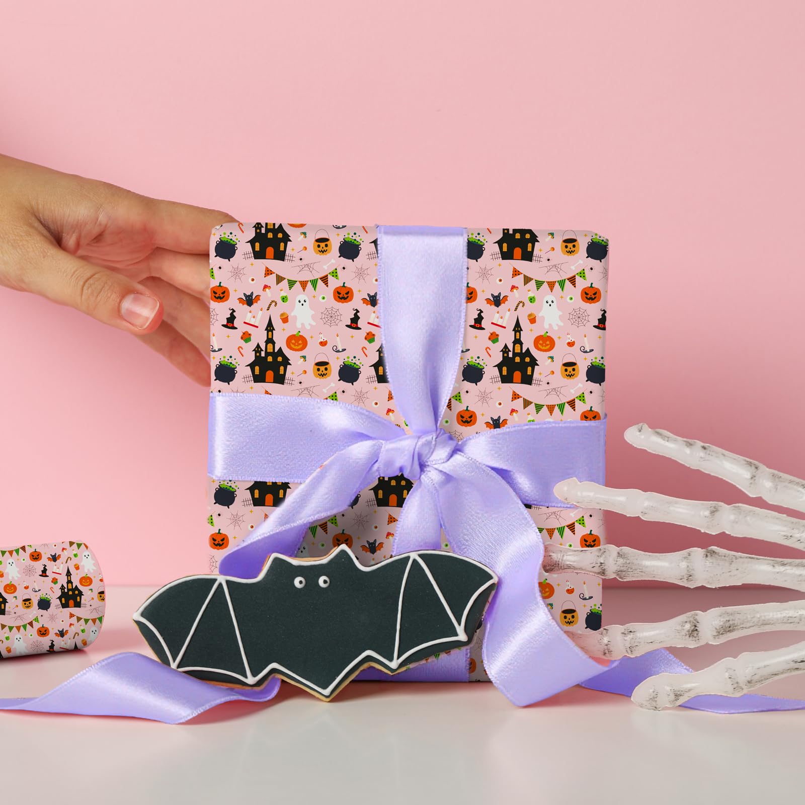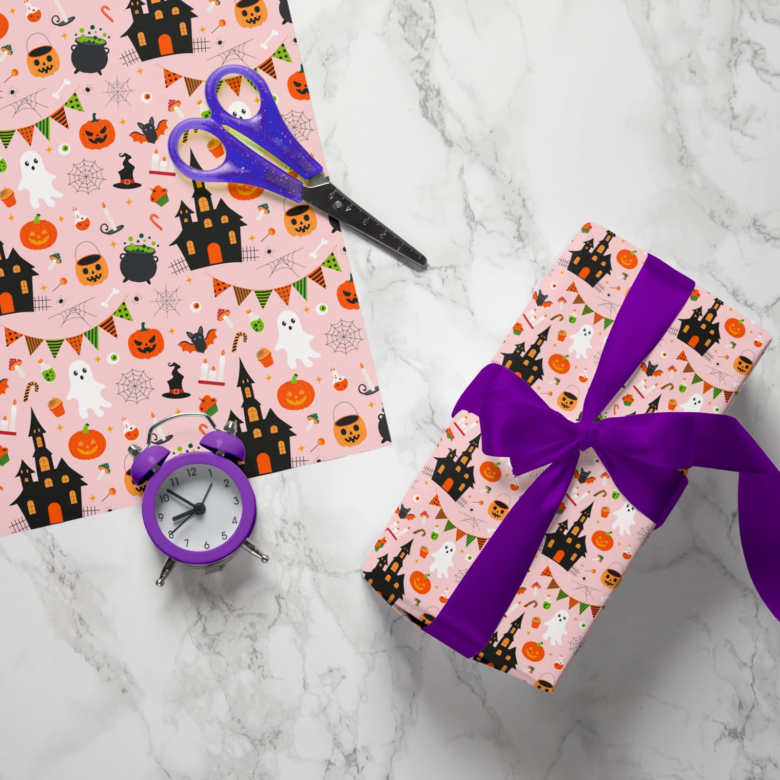 Striking Halloween Wrapping Design:The soft pink background, paired with spooky ghosts, pumpkins, and haunted houses, creates a playful holiday vibe. Perfect for adding a touch of Halloween fun to your presents.