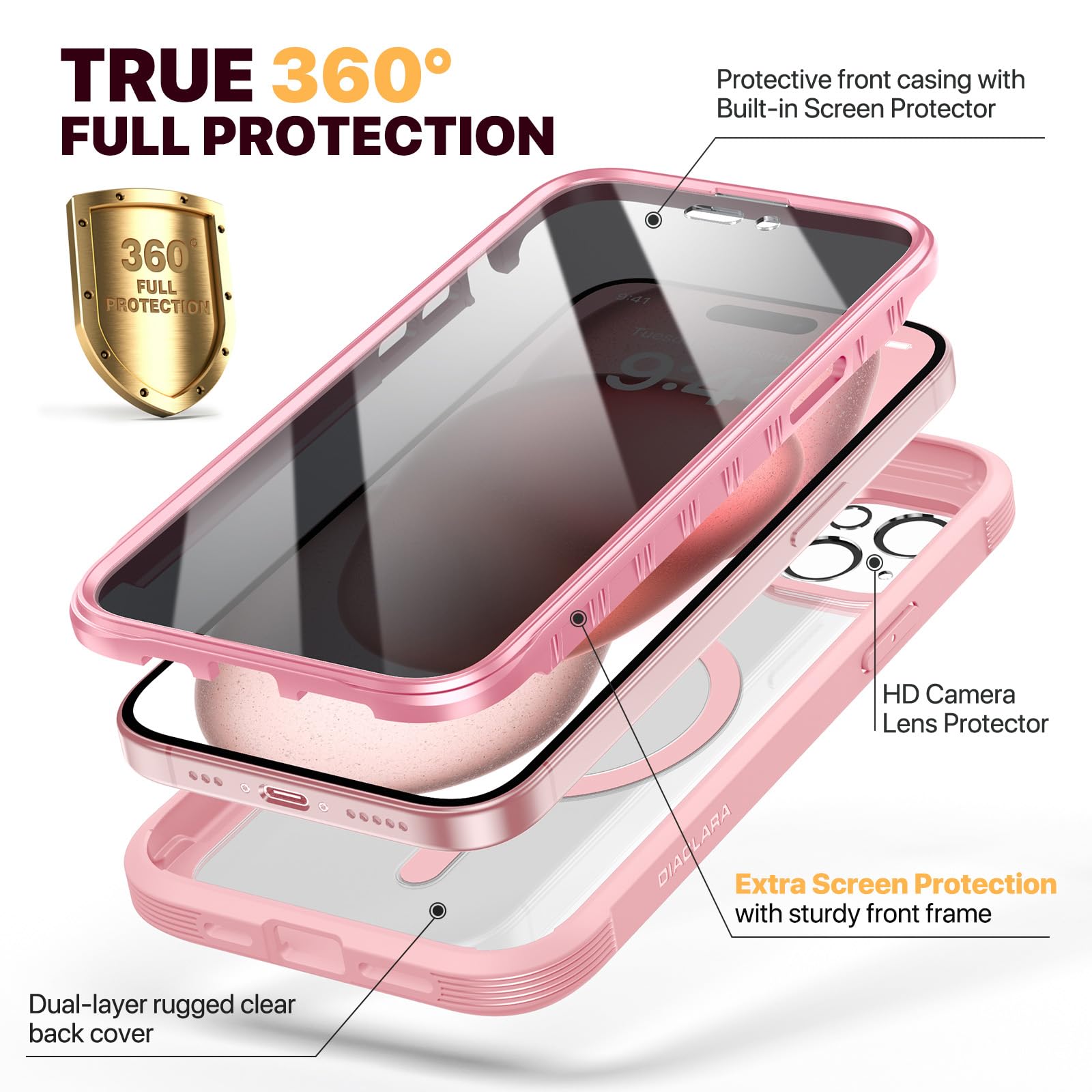【Never Break Built-in screen protector】 Diaclara clear designed for iPhone 15 case with built-in touch sensitive and anti-scratch screen protector, protect the fragile glass from scratches and cracks. Unlike regular glass, ours won't break