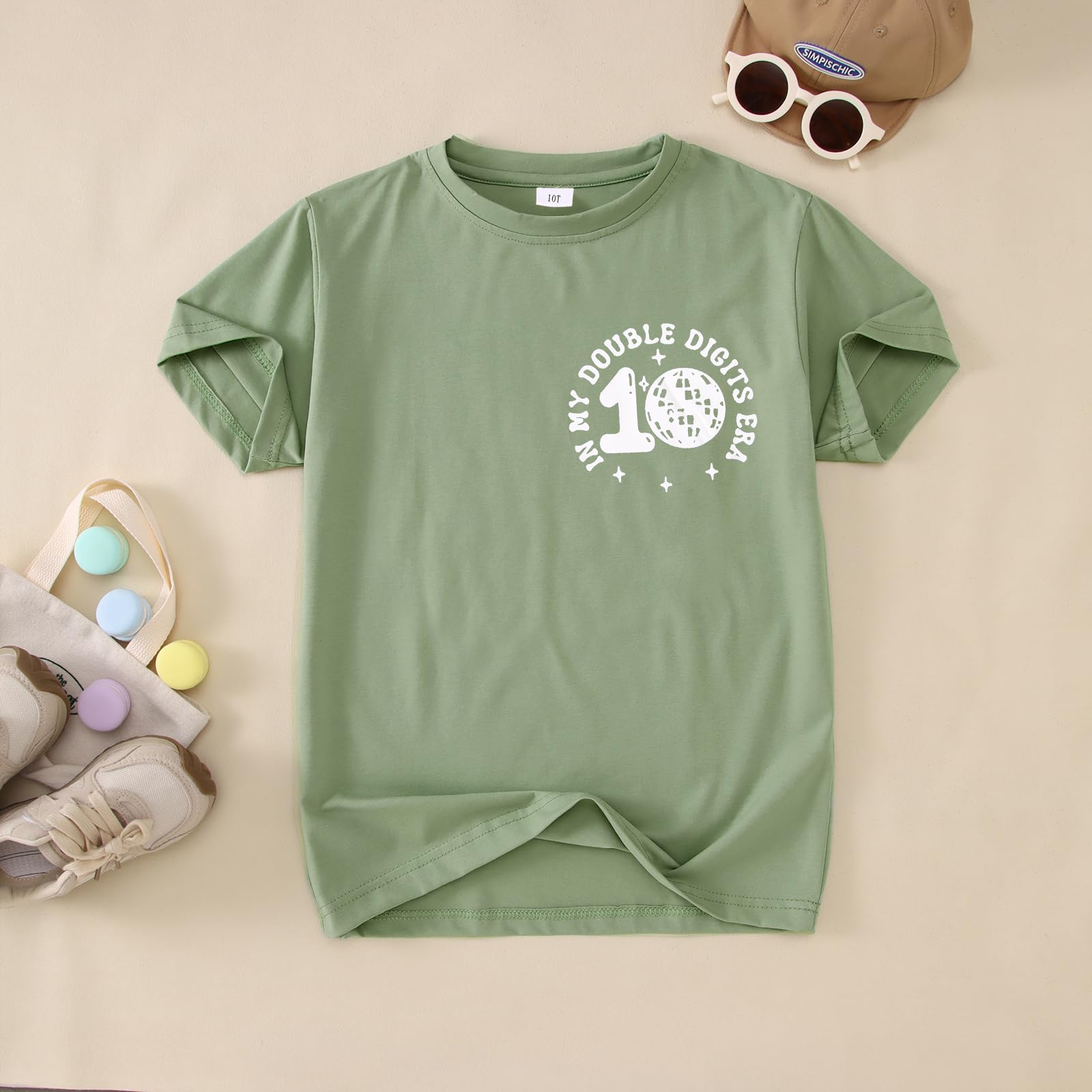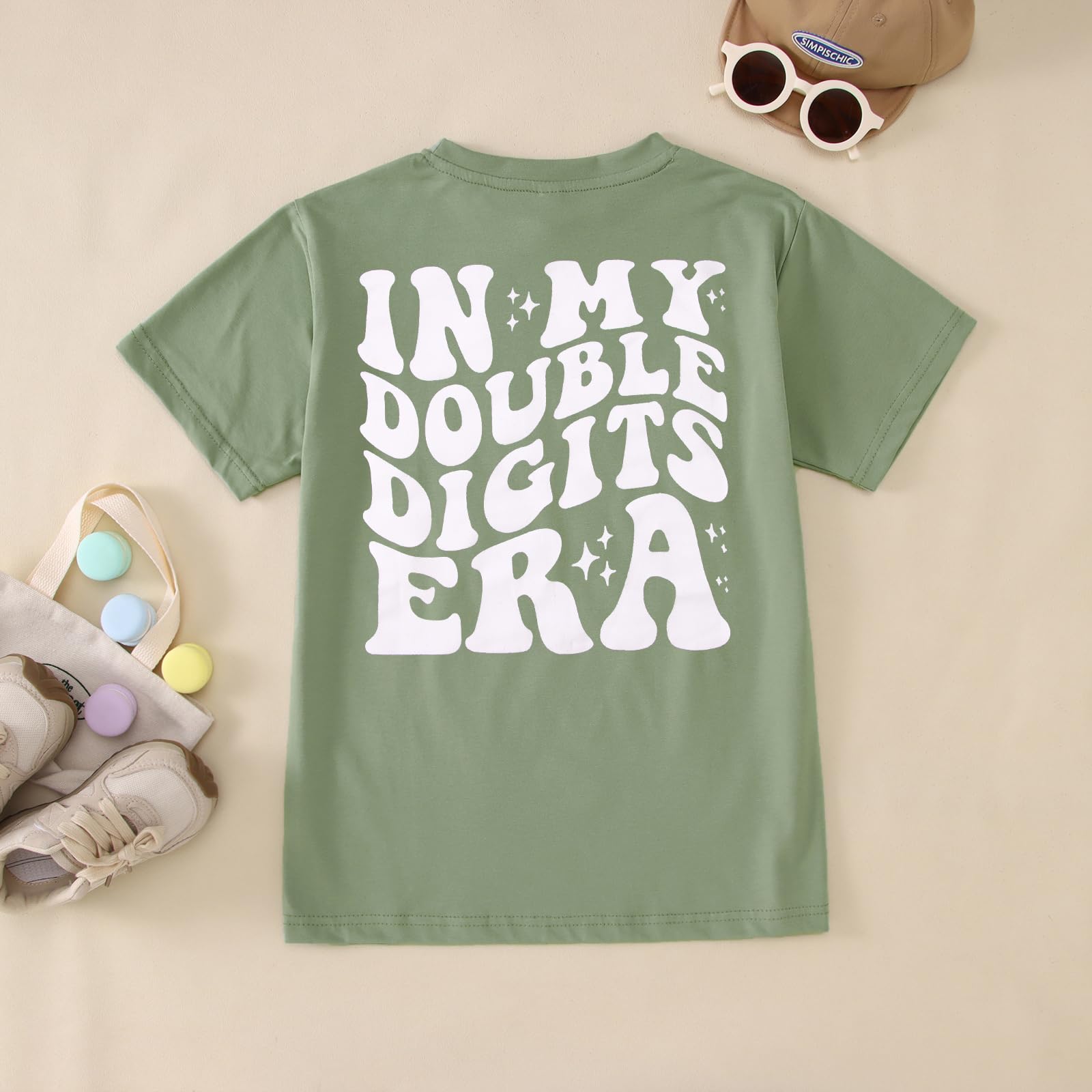 【Feature】In my double digits era t-shirts for boys. Short sleeve summer tees, classic round neck 10 years old boys shirts. 10th birthday boy t-shirt, groovy double-sided print design, in my double digits era letter print tops, star graphic, funny birthday gifts for 10 year old boys kids.