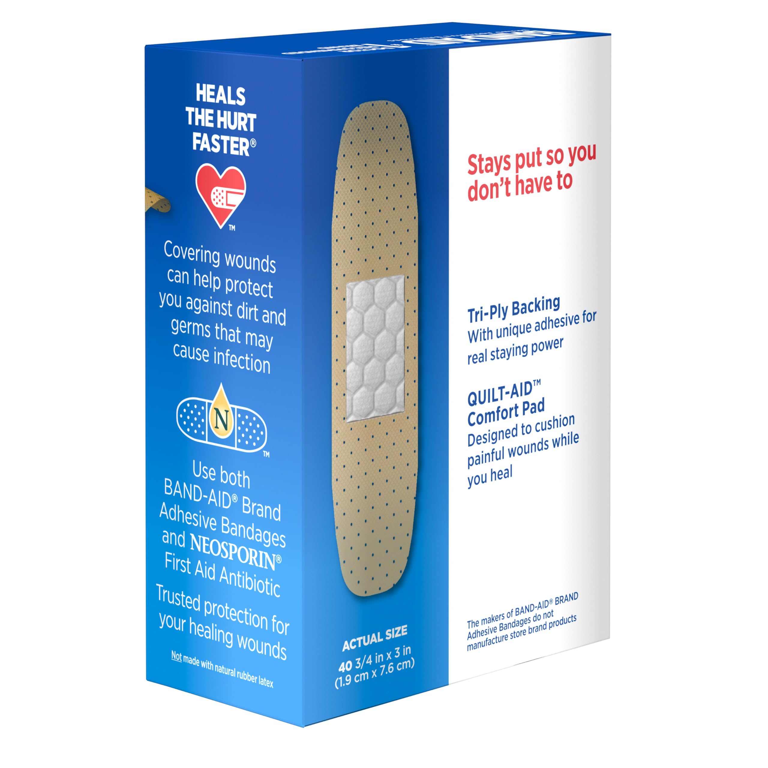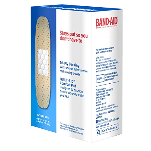 Band-Aid Brand Sterile Tru-Stay Sheer Strips Adhesive First Aid Bandages offer comfortable, sheer protection of minor wounds, cuts, scrapes and burns. These flexible Band-Aid Brand Adhesive Bandages for wound care in are designed to provide lightweight, dependable protection to cover most minor wounds. Covering wounds can help heal minor cuts and scrapes and protect you against dirt and germs that may cause infection. The individually wrapped bandages feature Tri-Ply Backing with unique adhesive for real staying power, so the bandage stays put so you don't have to. The unique Quilt-Aid Comfort Pad on these Band-Aid Brand Tru-Stay Sheer Strips Adhesive Bandages is designed to cushion and protect painful wounds while you heal and helps to prevent reinjury. This package includes 40 sheer bandages in all one size, making these bandages a perfect addition to any home first aid kit or wound care supplies.