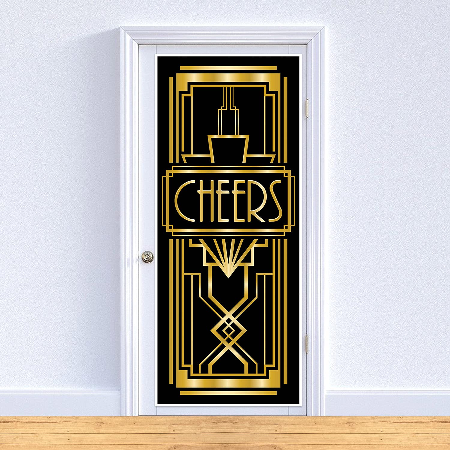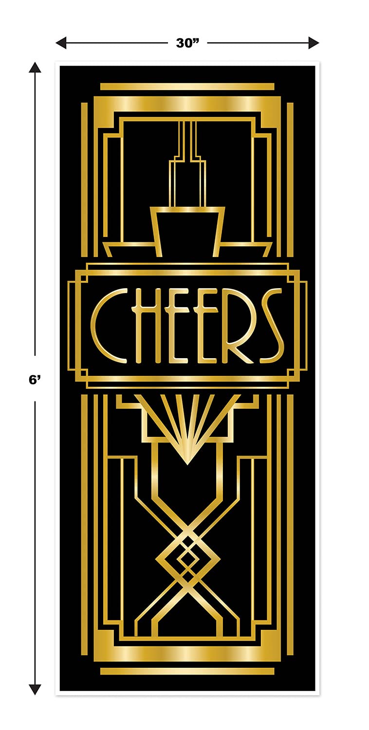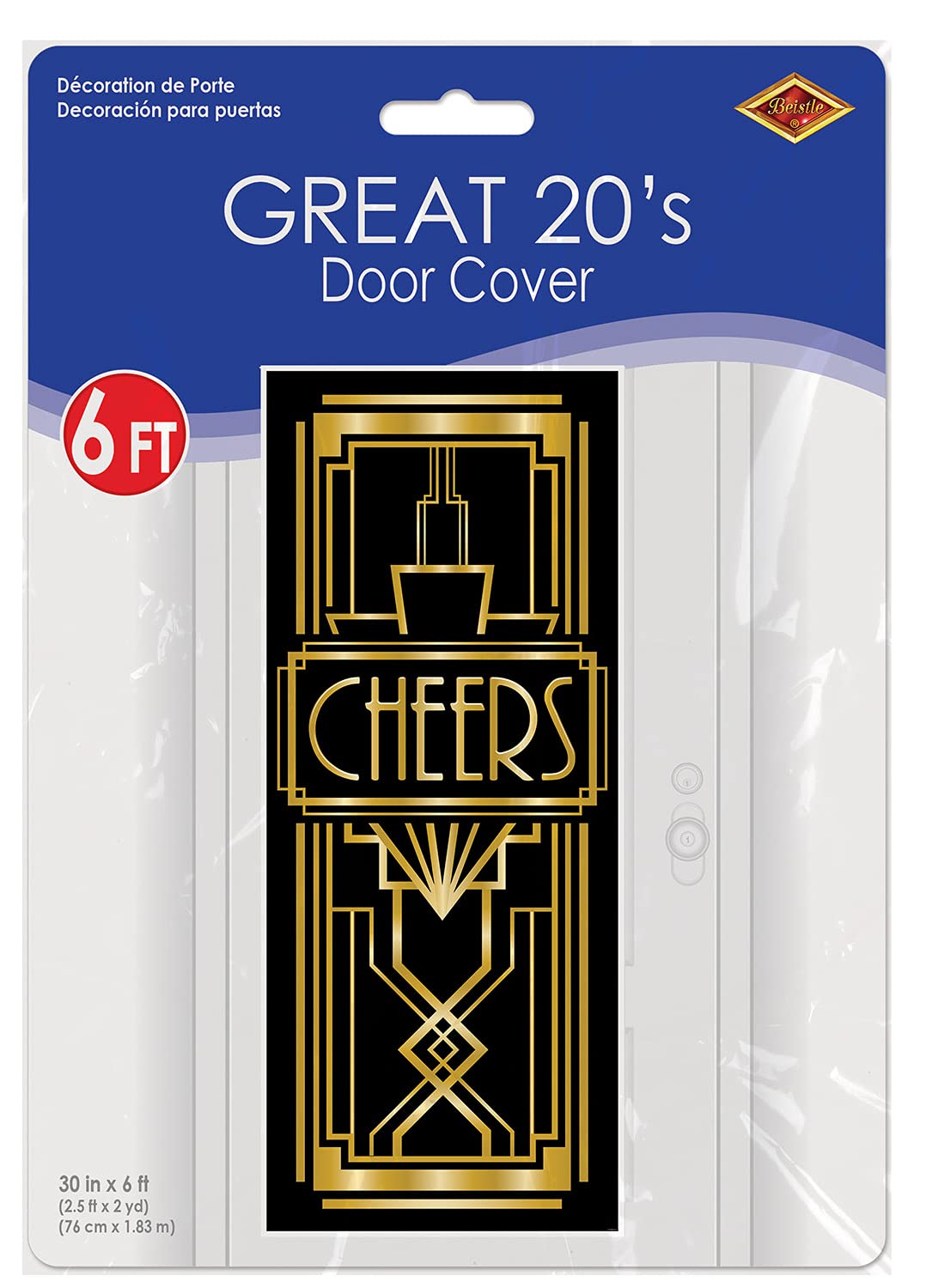 Bristle 59903 Great 20's Door Cover. The package contains 2 door covers. They are made of plastic and printed with black and gold colors. "Cheers" is printed in the middle of the door covers. Each door cover measures 30 inches wide by 6 feet tall. They are made for indoor and outdoor use. Hang these door covers up for a Great 20's themed party!.