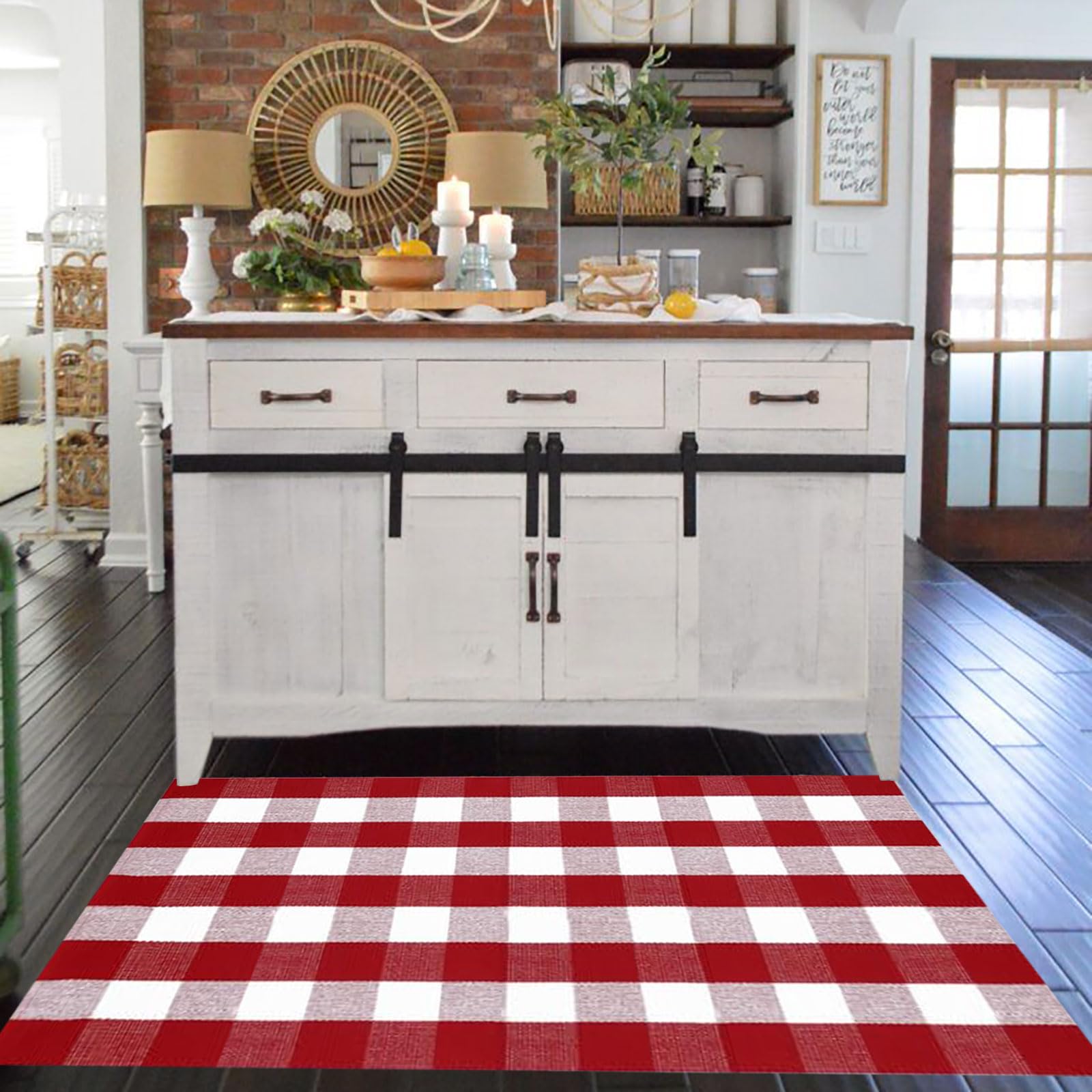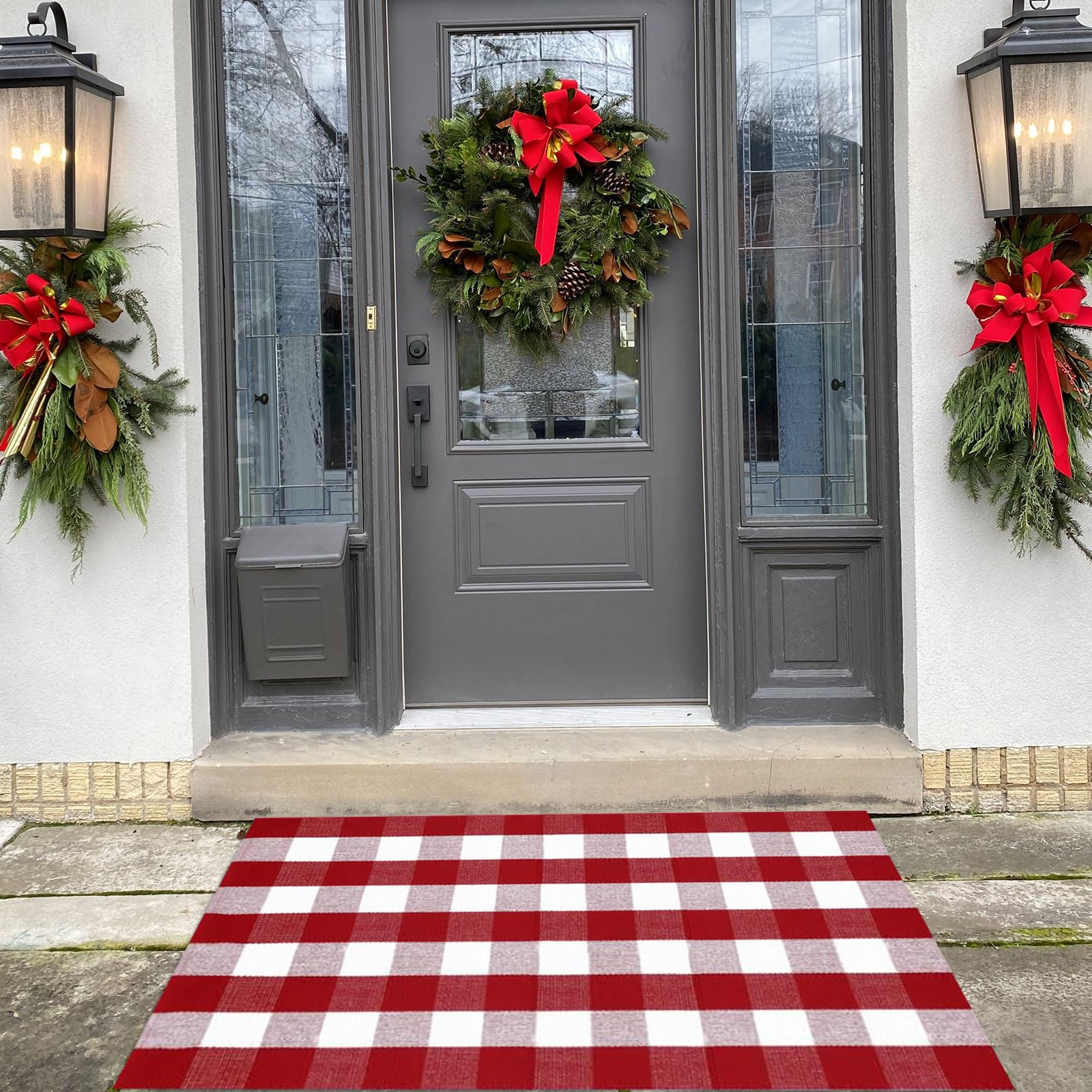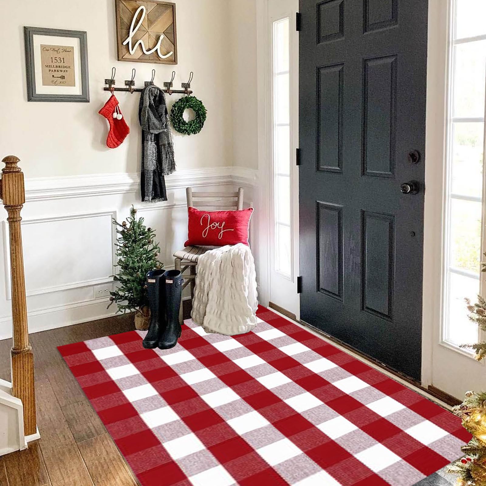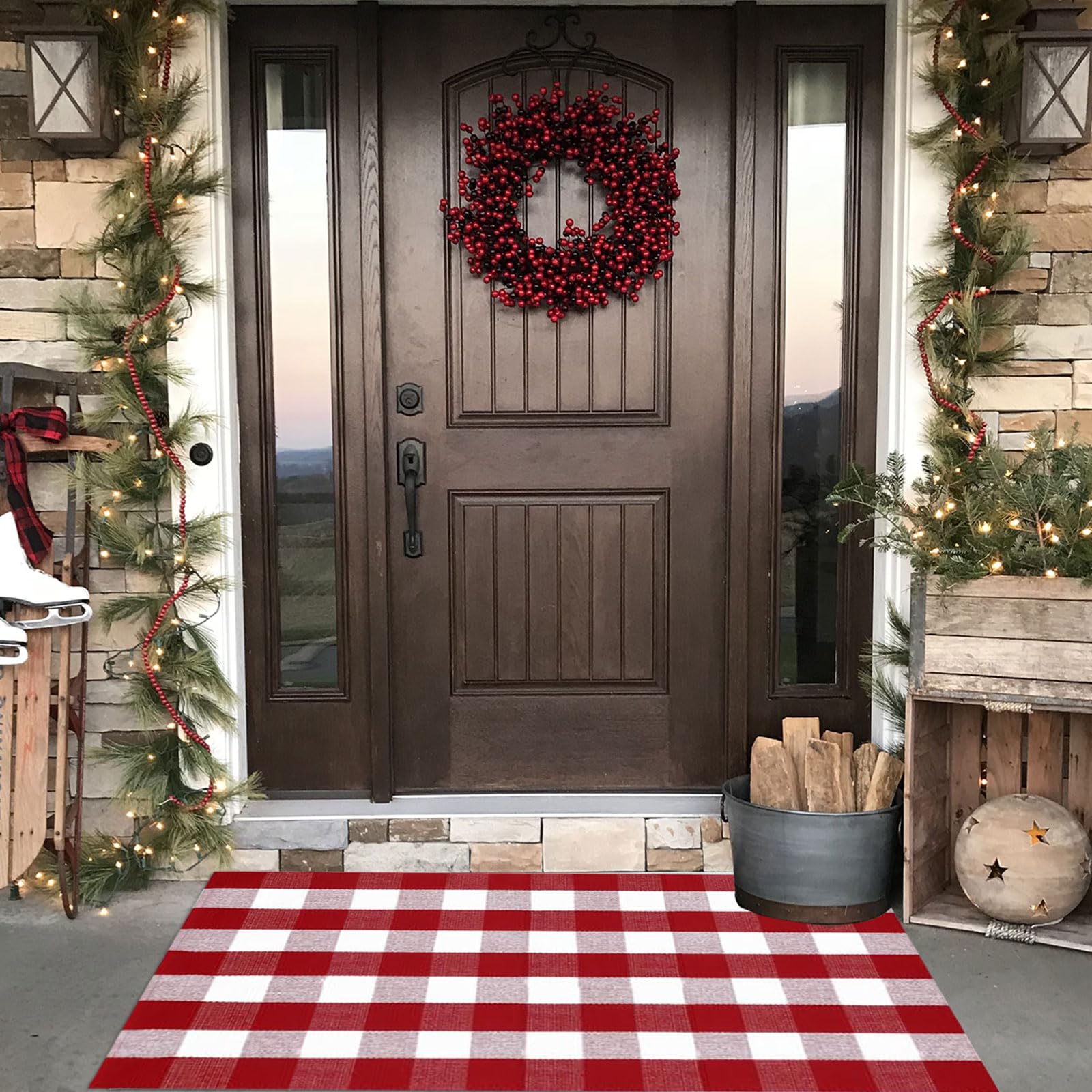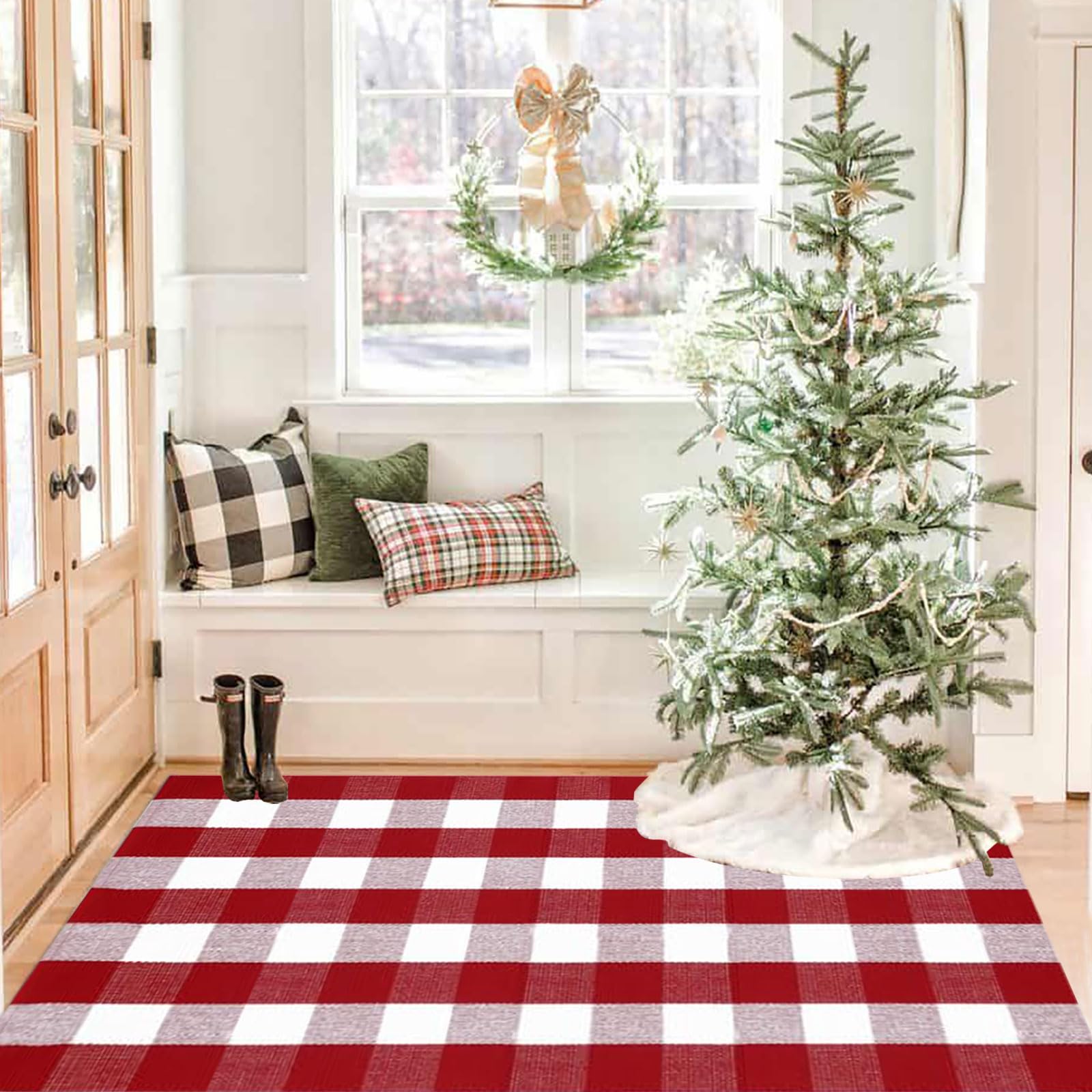 👍High Quality:Hand-woven buffalo plaid christmas decor rug is made of fabric cotton, the thick cotton material is elegant and luxurious, durable and comfortable, a great outdoor rug.