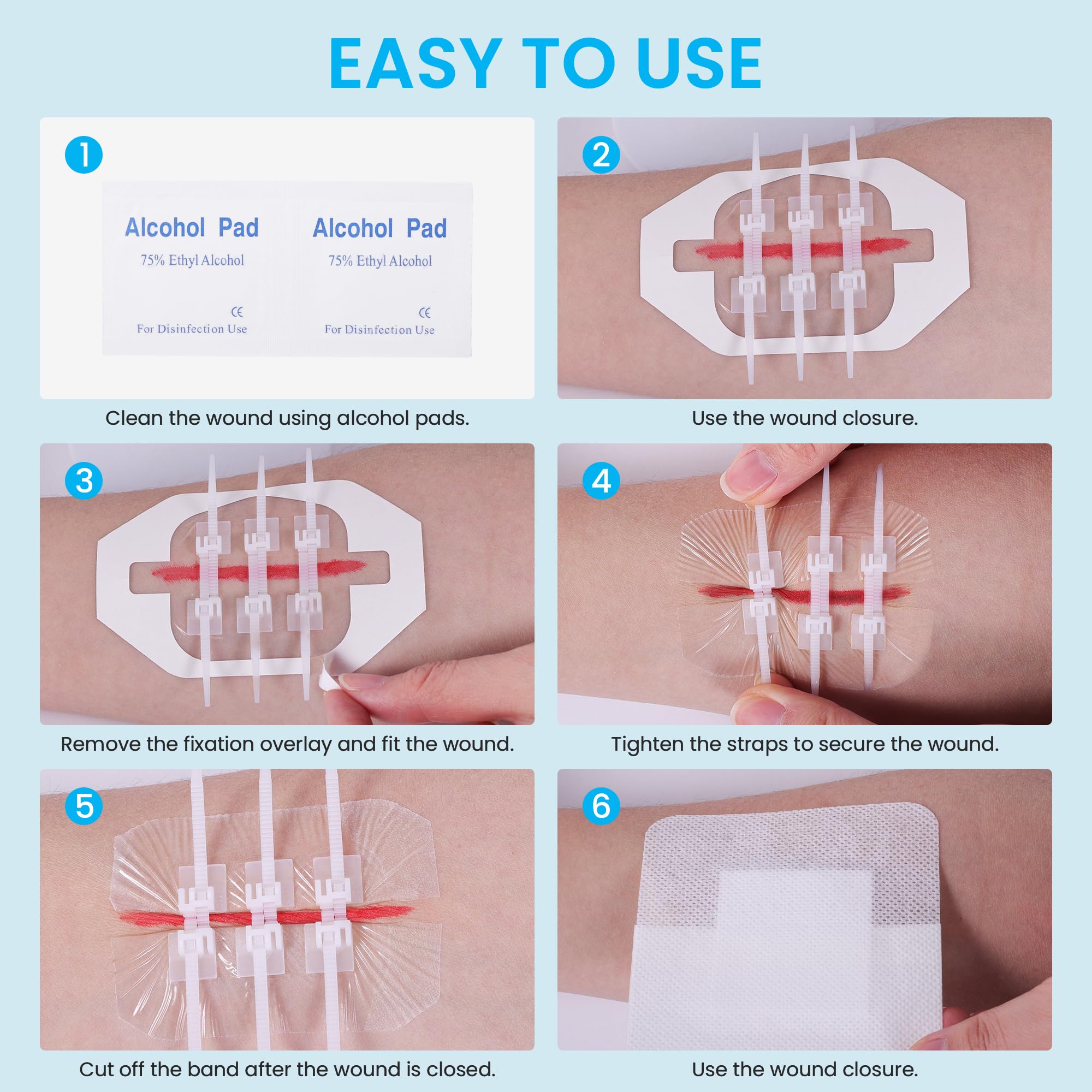First Aid Kit Essentials:The laceration closure strips kit contains: wound closure deviceX2, alcohol padX2,adhesive dressingX2. This set is convenient for emergency protection and all products are individually packaged for cleanliness and ease of use