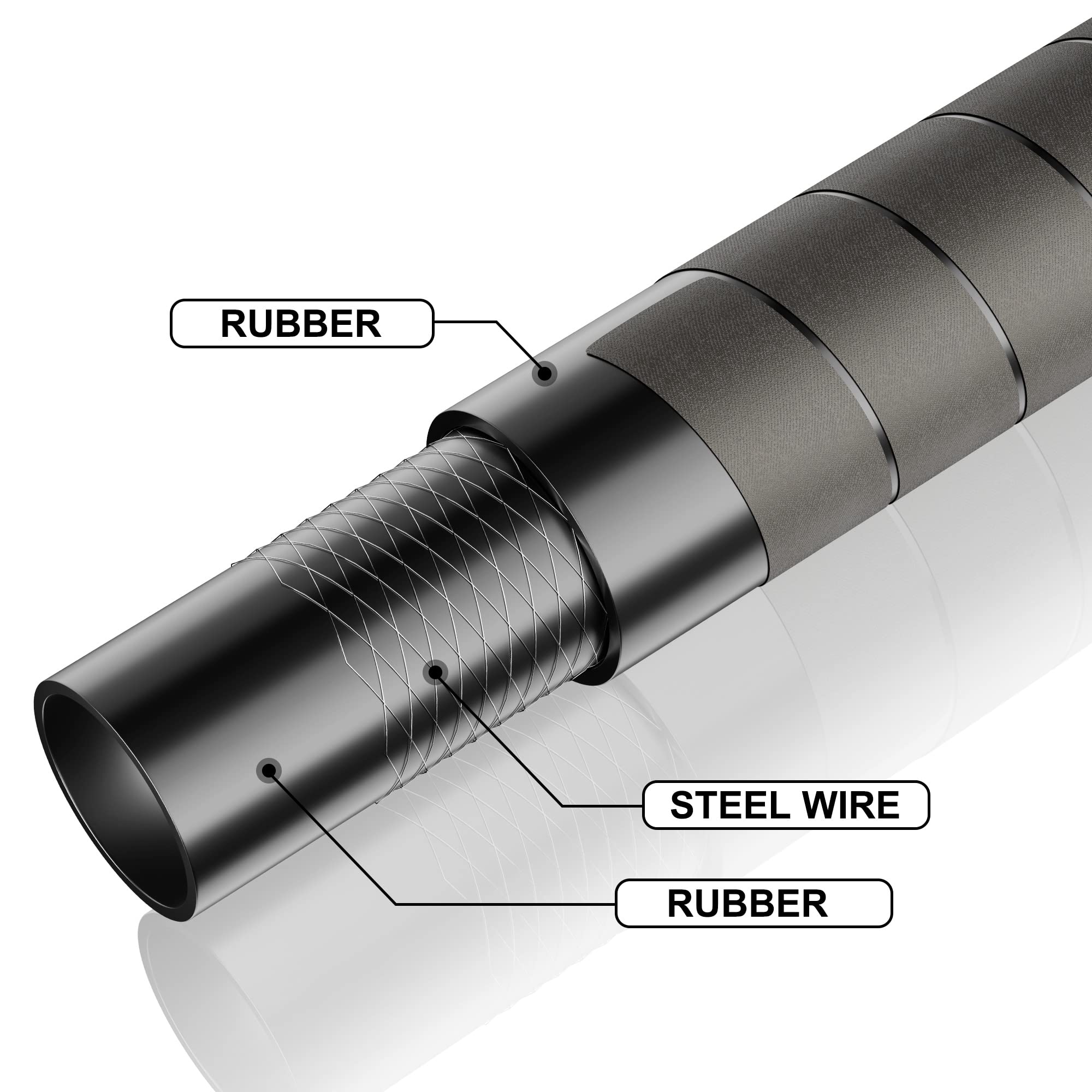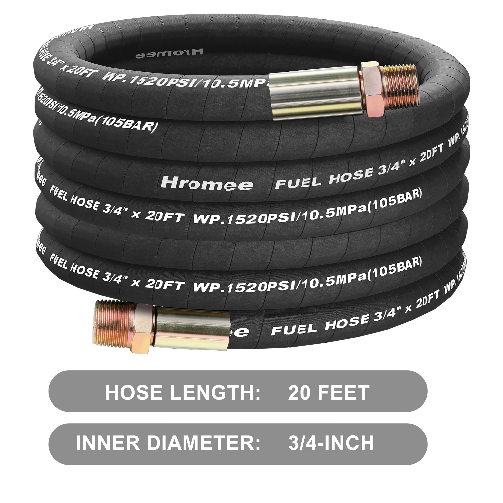 Inner diameter:3/4”; hose length: 20’. The hose is made of rubber and steel wire inside two rubber layer.