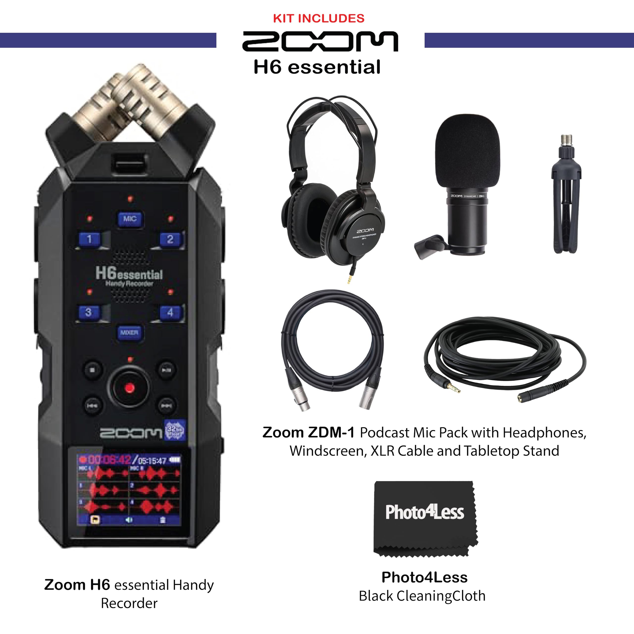 BUNDLE INCLUDES: This comprehensive kit includes The Zoom H6essential 6-Track 32-Bit Float Portable Audio Recorder Bundle With Zoom ZDM-1 Podcast Mic Pack with Headphones, Windscreen, XLR Cable and Tabletop Stand