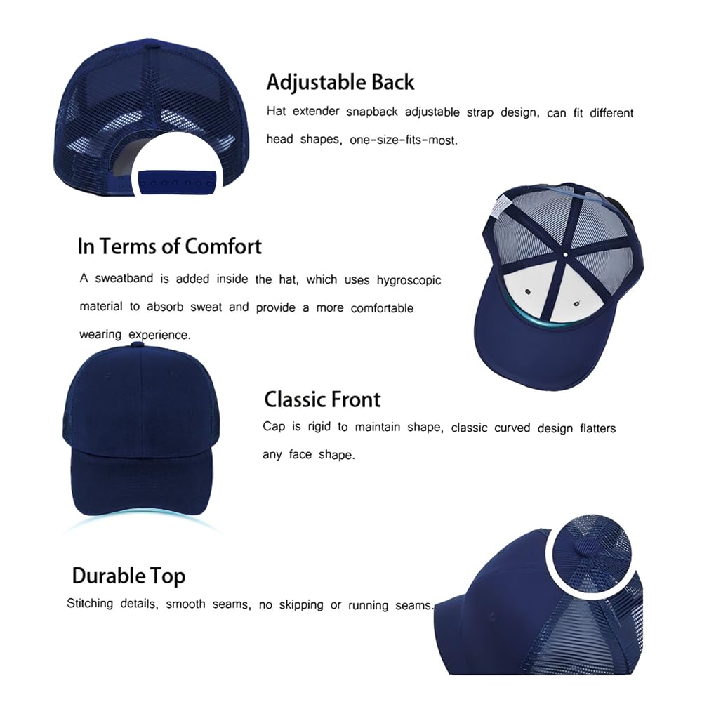 [Comfortable & Lightweight ]: Made from a durable blend of polyester and mesh fabric, our hats are lightweight and comfortable. The front panel and breathable mesh back ensure excellent ventilation , while the brim offers UV protection, making them ideal for outdoor activities.